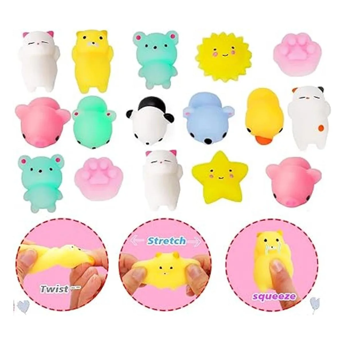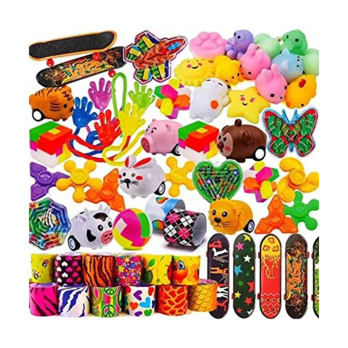 50 pack party favors toys set: 10 Slap Bracelets, 6 Mochi Squishy Toys, 6 Sticky Hands, 6 Puzzle Balls, 6 Finger Skateboards, 4 Maze Puzzles, 6 Animal Pull Back Cars, 6 Finger Spinners. Total 50 Pcs Prizes Toys Bundle.