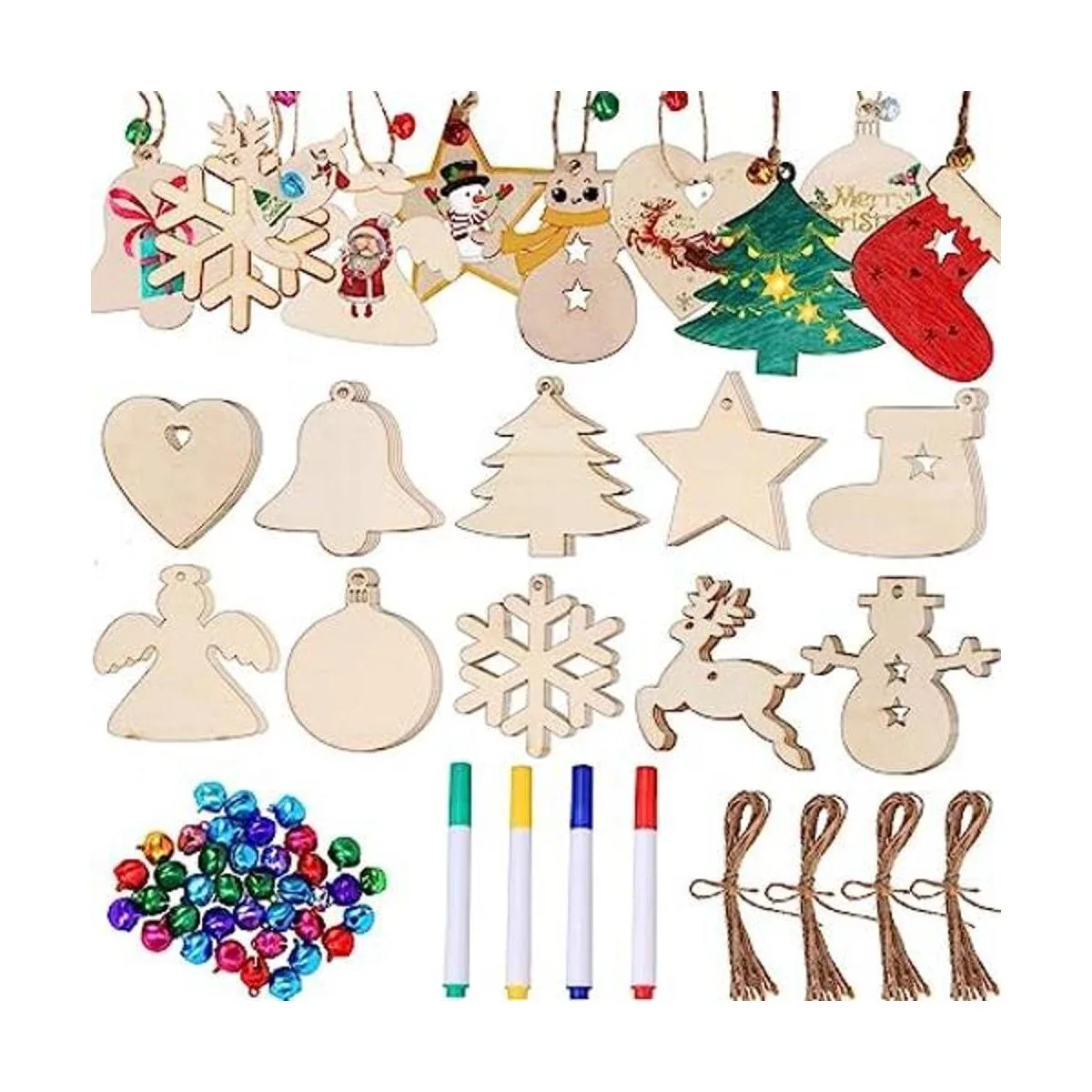 El paquete incluye: El paquete incluye 50 adornos de madera de Navidad en 10 formas diferentes, como árbol de Navidad, copo de nieve, reno, campana, medias, amor, anillo de madera, muñeco de nieve, alce y ángel. También hay 50 cuerdas, 50 campanas y 4 bolígrafos de colores, que son adecuados para cualquier proyecto de manualidades.