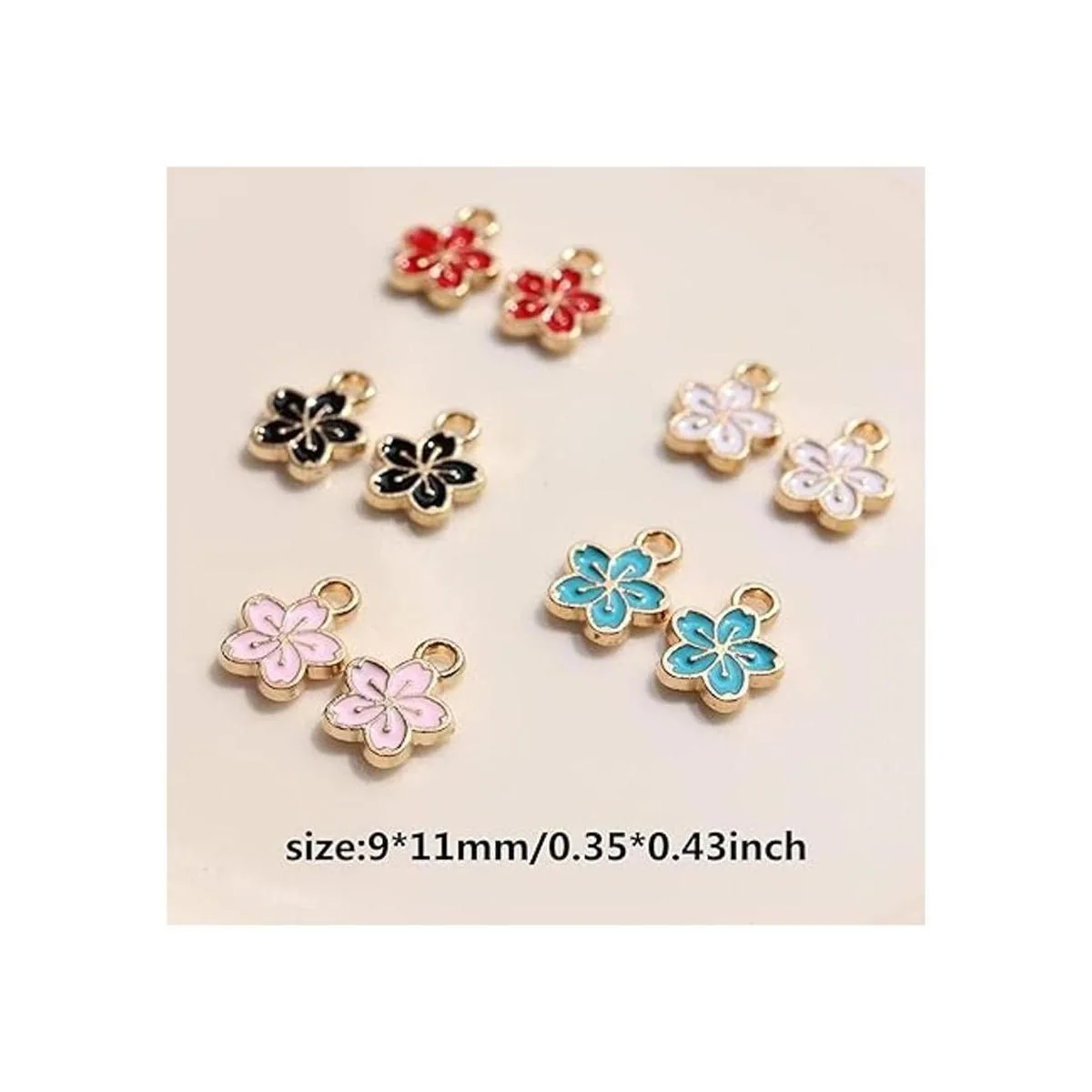 Mini colgantes flotantes de flores: colgantes de flores esmaltadas de Sakura en 5 colores surtidos, cuentas de flores negras, colgantes de flores azules, cuentas de flores rosas, colgantes de flores blancas, cuentas colgantes de flores rojas. El tamaño medio es pequeño, 0.354 x 0.433 in. 10 unidades por cada color, total 50 piezas de joyería de flores.