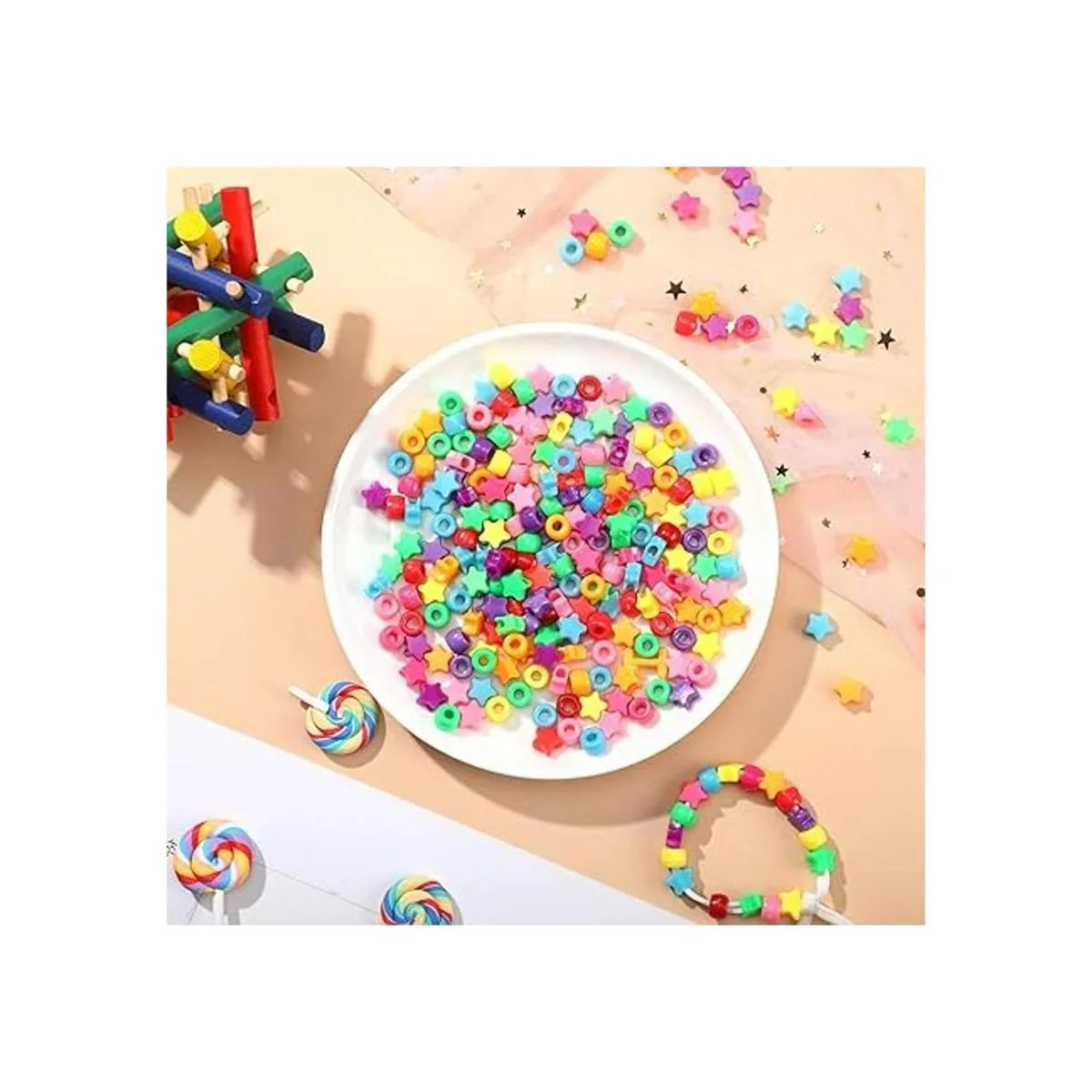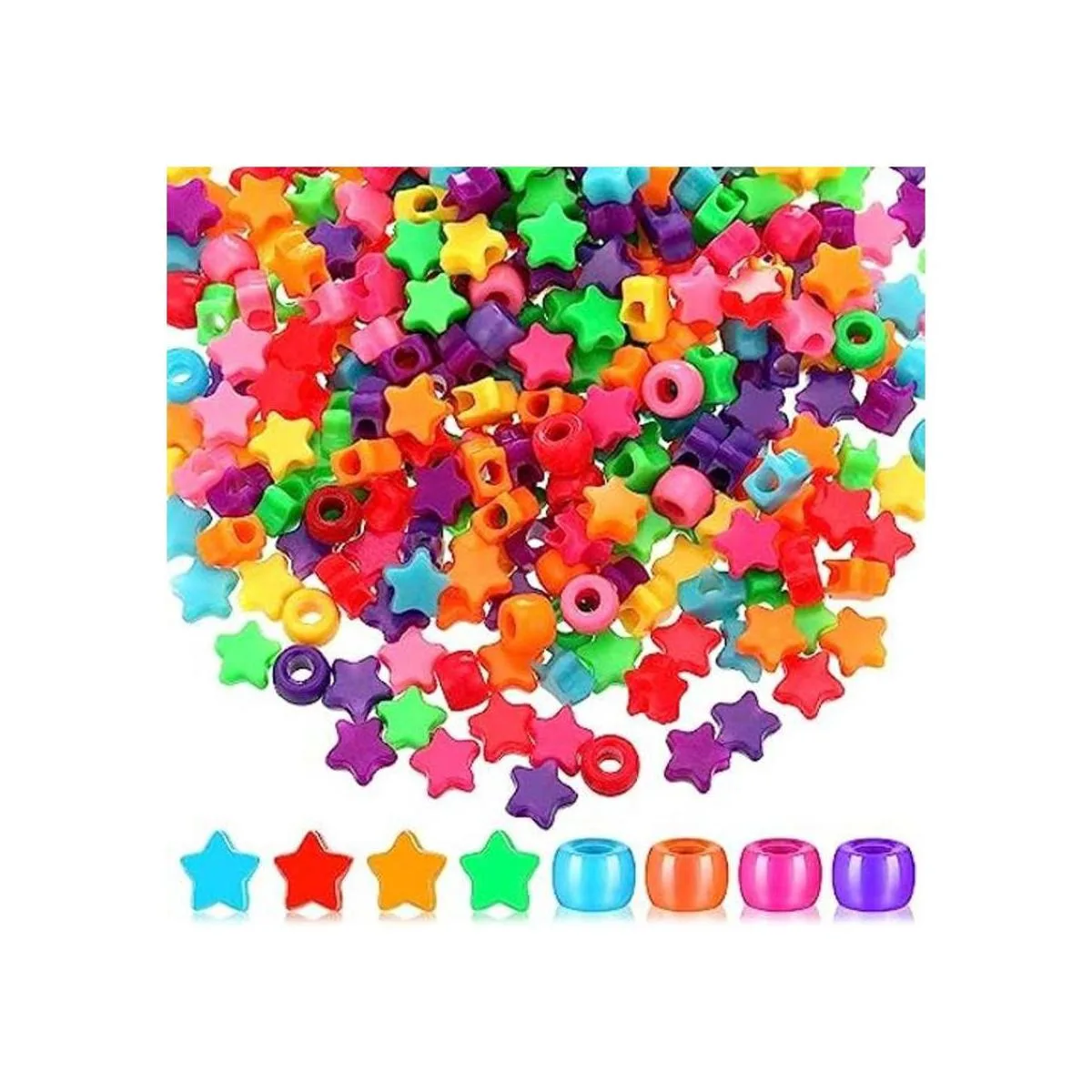Incluye: este paquete contiene 500 piezas de cuentas de plástico, disponibles en 2 estilos, forma de estrella y forma de barril, 250 piezas para cada estilo, que pueden satisfacer tus diversas necesidades de decoración.