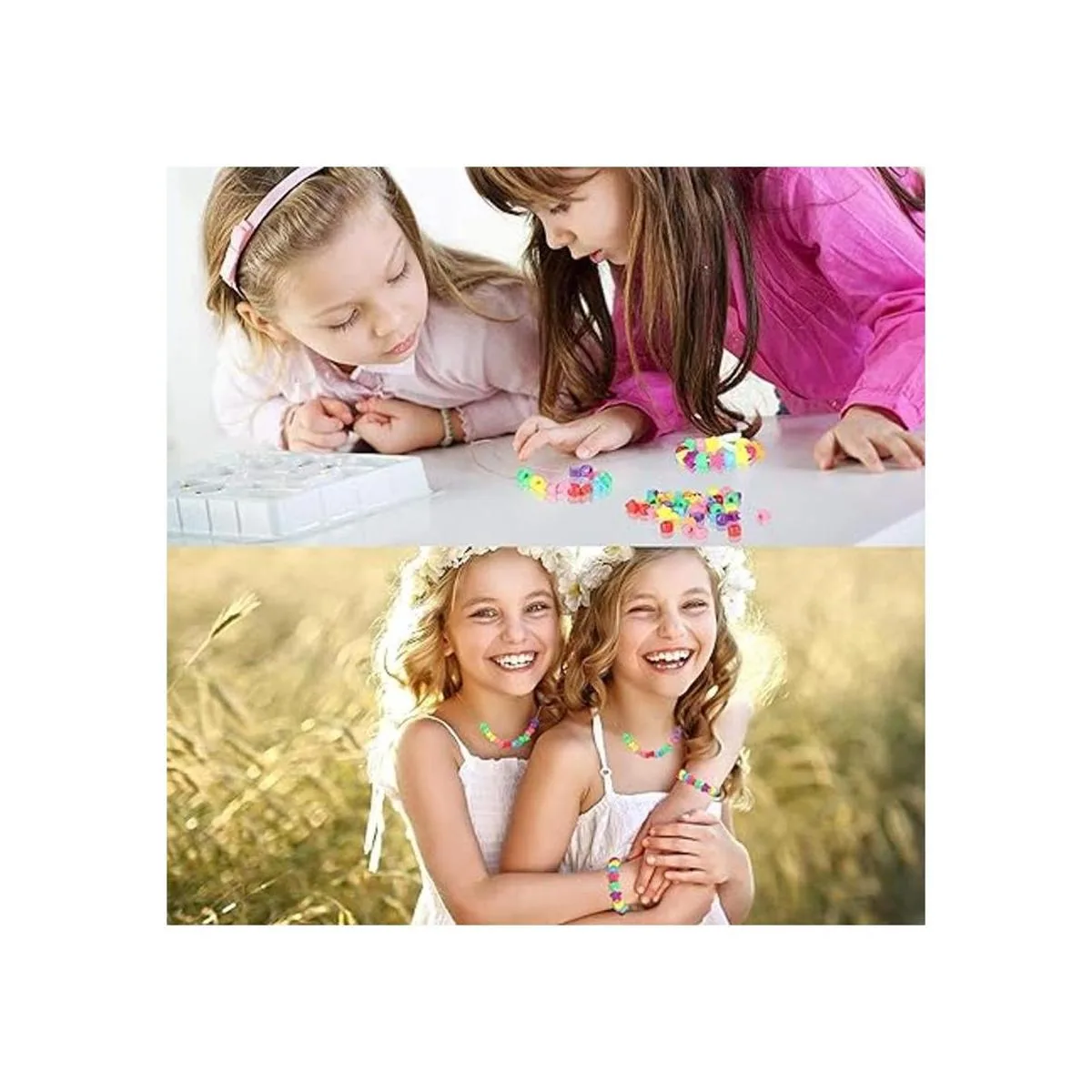 Suministros para la elaboración de joyas: las cuentas de pony se pueden mezclar o combinar con diferentes combinaciones para hacer varios tipos de joyas, como hacer pulseras de amistad, collares con nombre, trenzas para el pelo y mucho más. El agujero es lo suficientemente grande como para pasar a través de la mayoría de cadenas o cuerdas, el abalorio puede ejercitar la coordinación ojomano y las habilidades motoras finas, individualidad, la imaginación y la expresión propia.