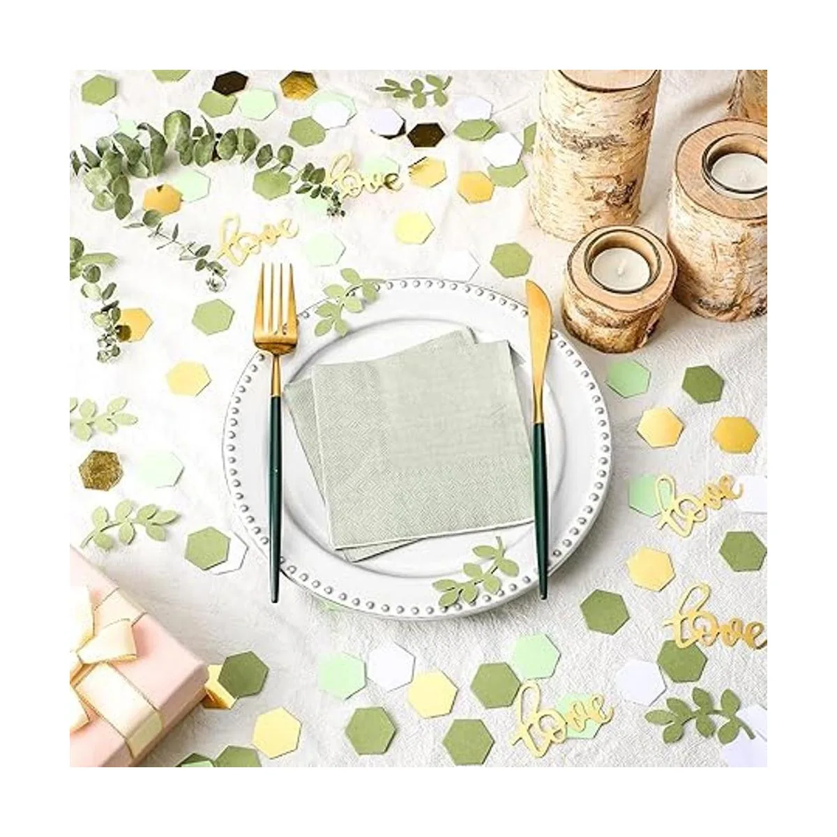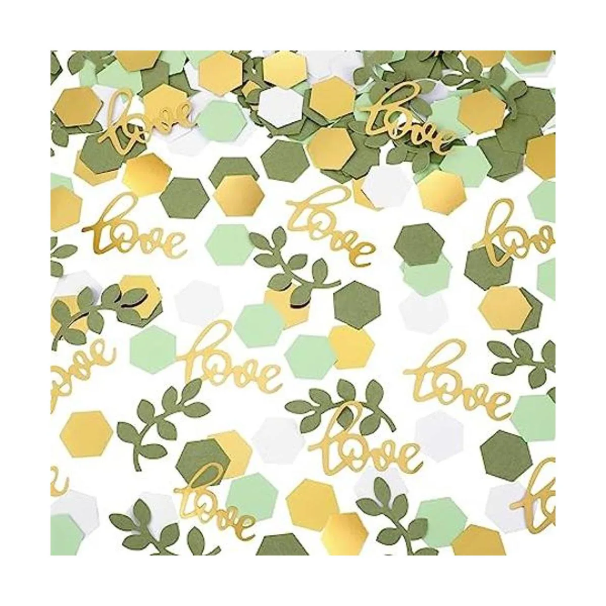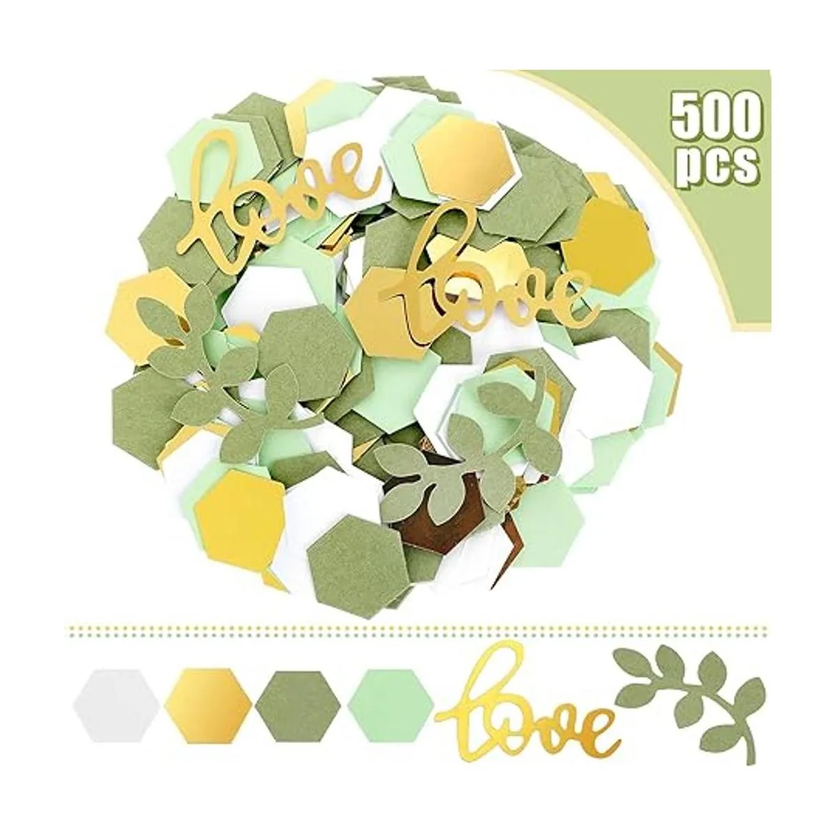 Cantidad suficiente en el paquete: recibirás 500 piezas de decoraciones de mesa de despedida de soltera en 3 estilos diferentes a la vez, incluyendo 380 piezas de confeti hexagonal en 4 colores, oro, verde té, verde claro y blanco, cada uno mide alrededor de 1.0 in de longitud, 60 piezas de confeti de hoja verde azulado y 60 piezas de confeti de amor dorado, cantidades suficientes pueden Satisface tus necesidades de uso diario Para decoraciones