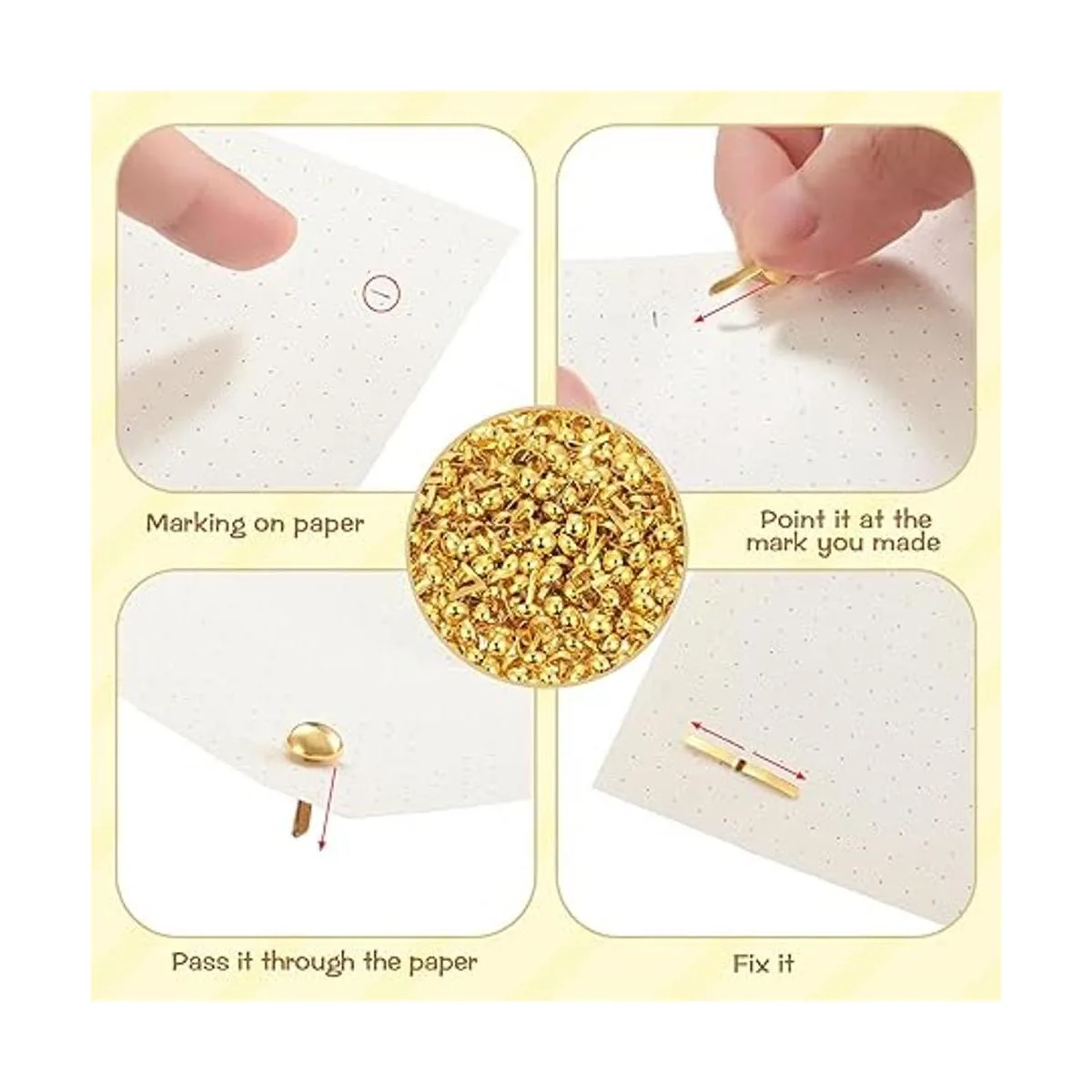 Función: los cierres de latón están diseñados con puntos autoperforantes que perforan automáticamente el papel y están firmemente fijos; estos resistentes cierres chapados en latón proporcionan una manera eficaz y atractiva de sujetar documentos juntos de forma segura