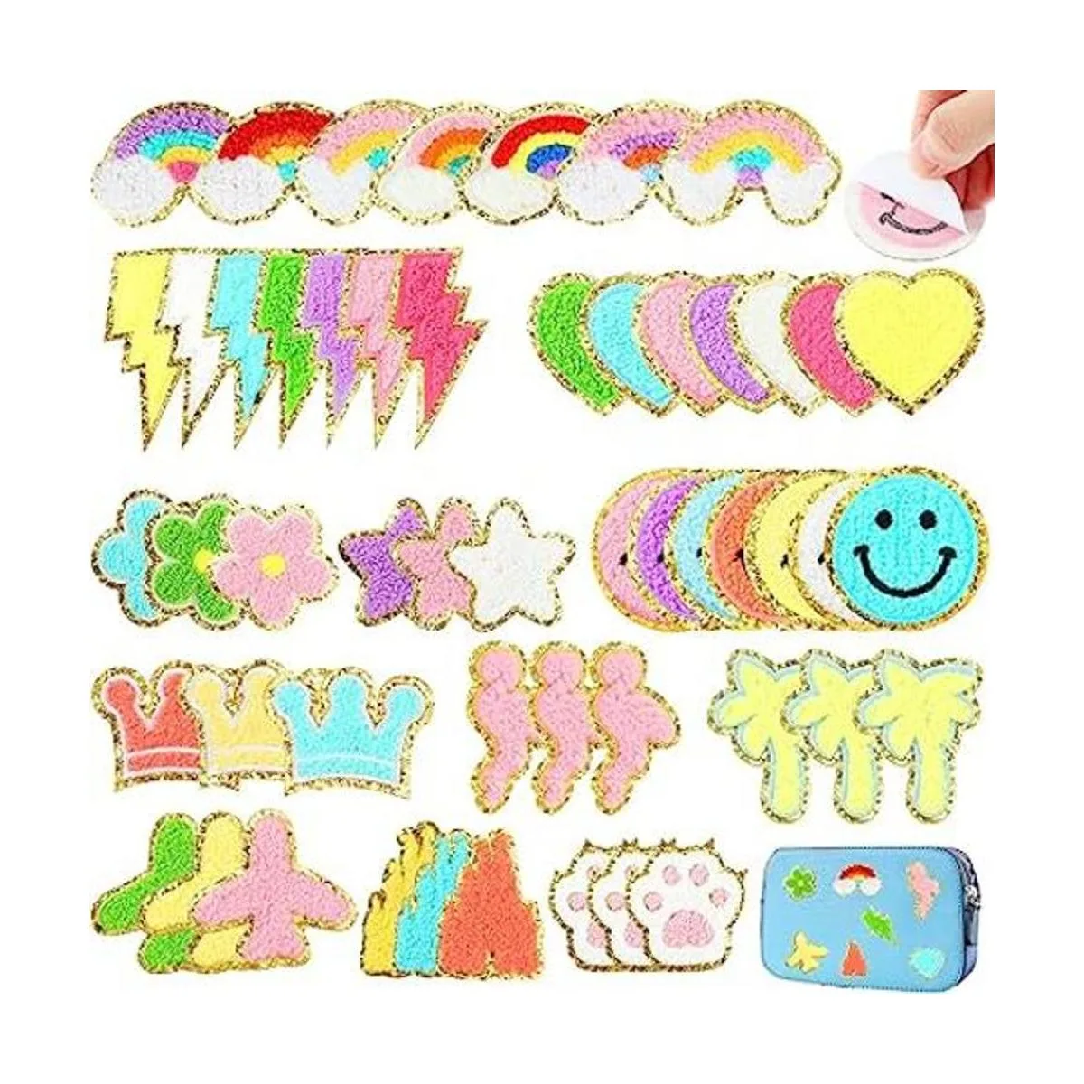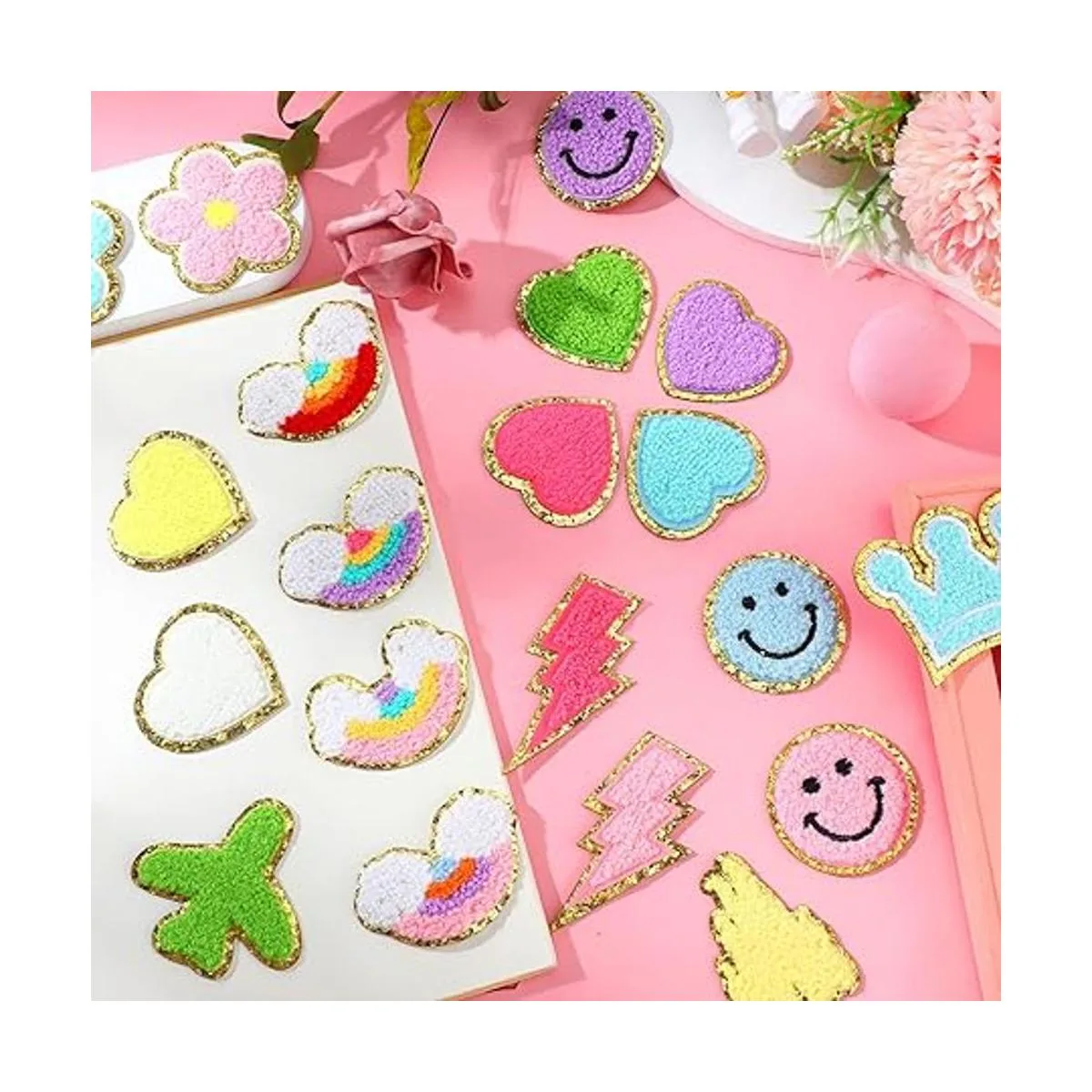 52 parches de felpilla autoadhesivos coloridos y lindos parches bordados de felpilla, parches de felpilla con cara de sonrisa, corazón, relámpago, parches de flores arco iris, parches para ropa, tela, chaquetas, bricolaje para teléfono celular