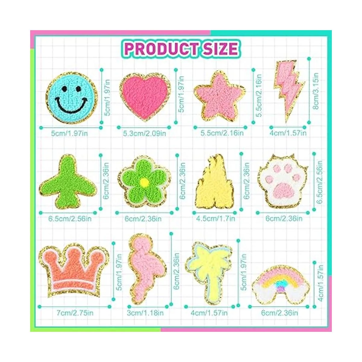 Muchos patrones bonitos: hay 12 tipos diferentes de estos parches de chenilla, incluyendo cara sonriente, avión, arco iris, estrella, flor y así sucesivamente, diseñados con bordes dorados, lindos y delicados, fáciles de llamar la atención de los demás, mostrando tus buenos gustos