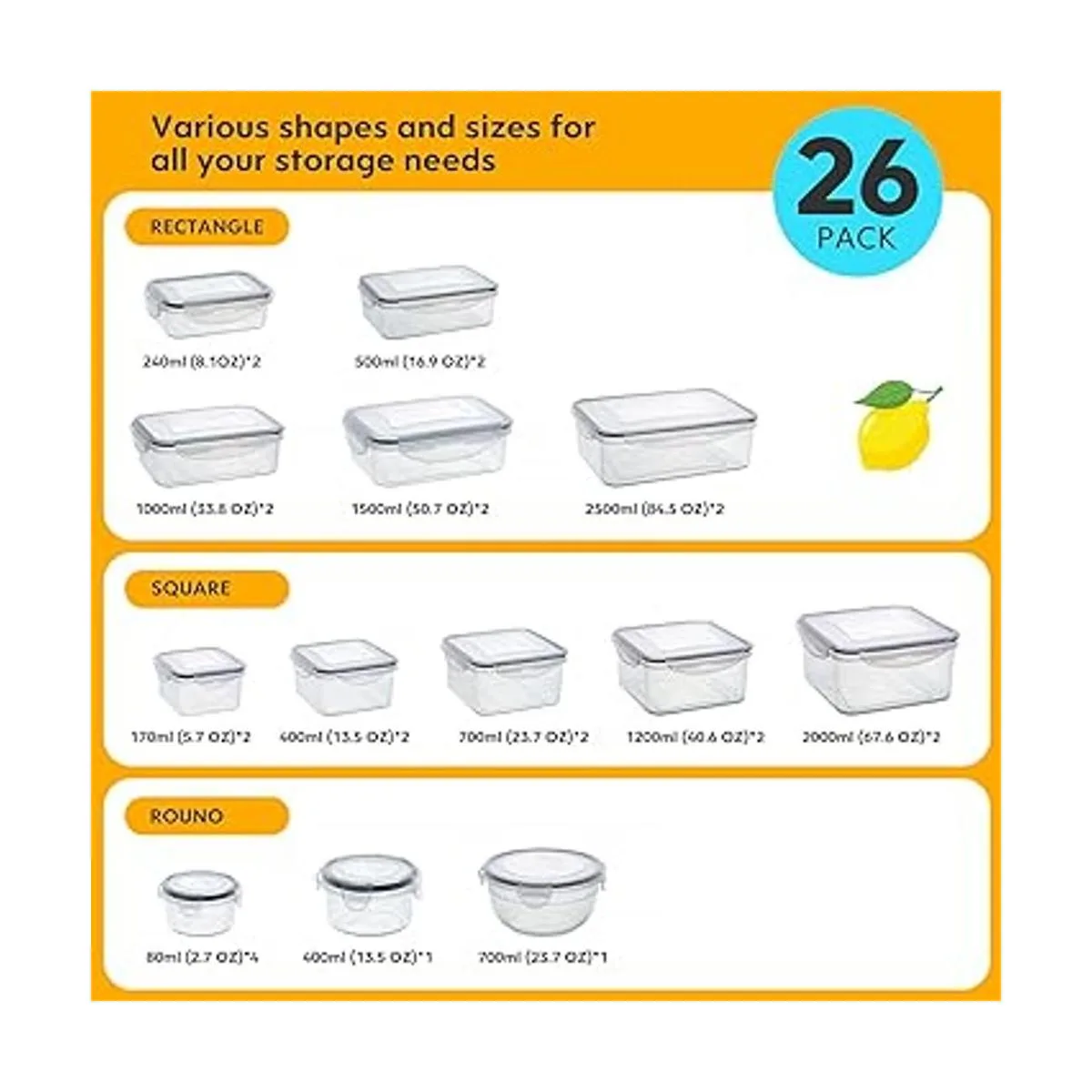 Various Shapes Large Sizes Youll get 26piece airtight food storage containers in three shapes and multi sizes. Rectangular Large Container: 2 X 84.5 OZ, 2X 50.7 OZ, 2 X 33.8 OZ, 2 X 16.9 OZ, 2 X 8.1 OZ, Round Crisper: 1 X 23.7 OZ, 1 X 13.5 OZ, 4 X 2.7 OZ, Square Crisper: 2 X 67.6 OZ, 2 X 40.6 OZ,2 X 23.7 OZ, 2 X 13.5 OZ, 2 X 5.7 OZ