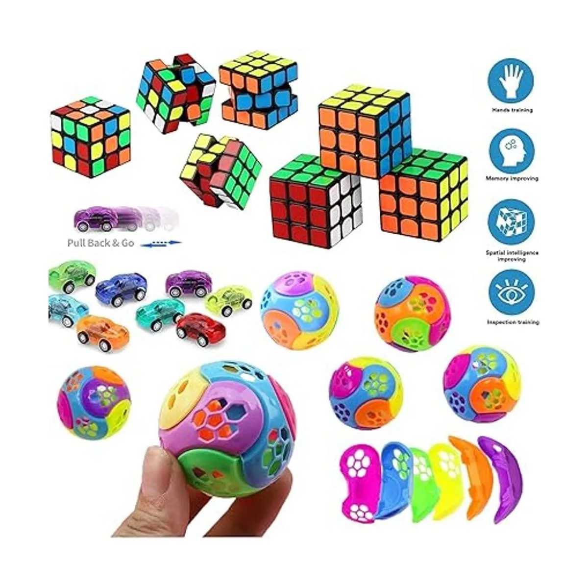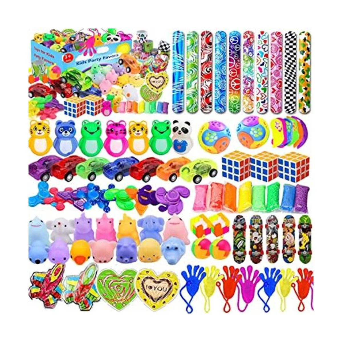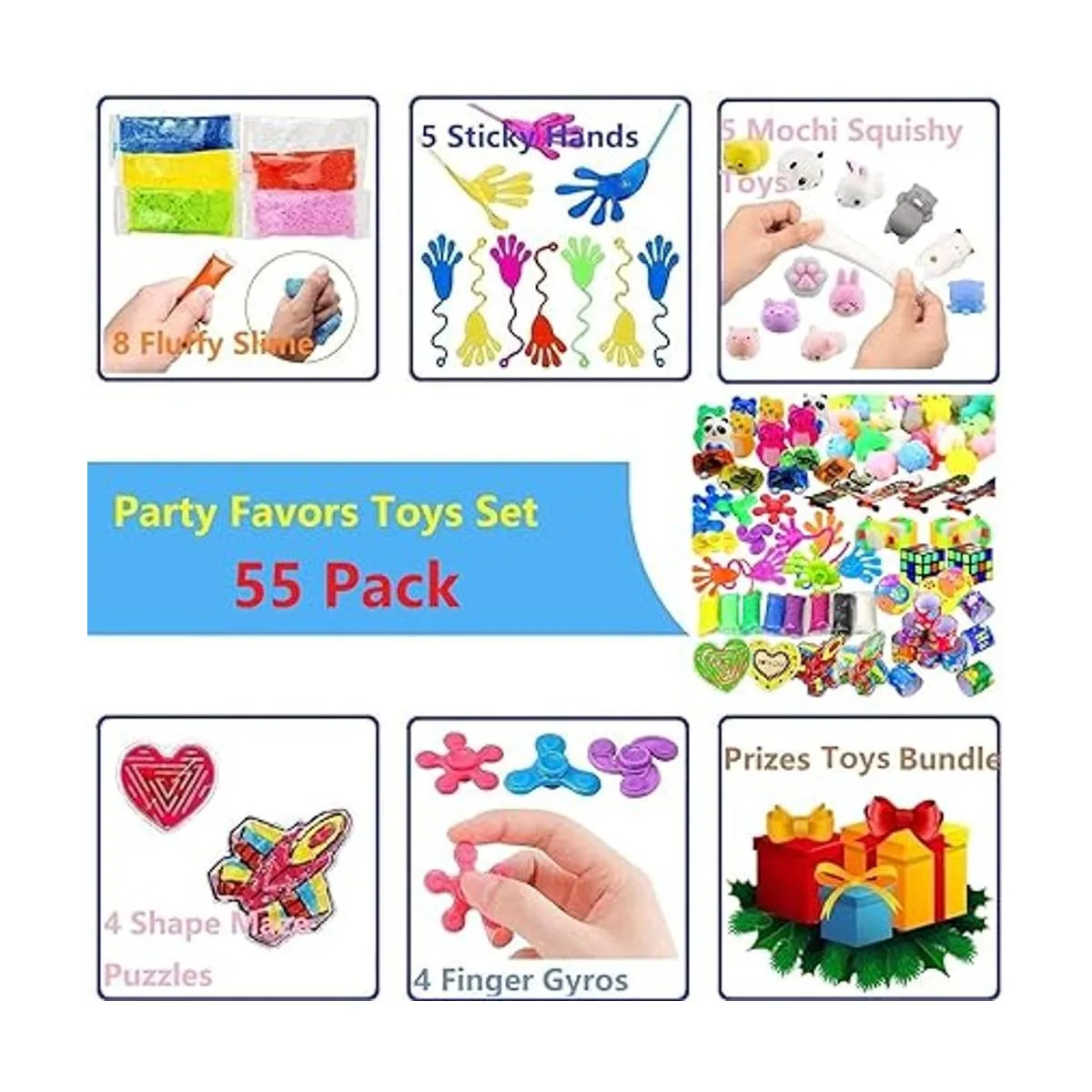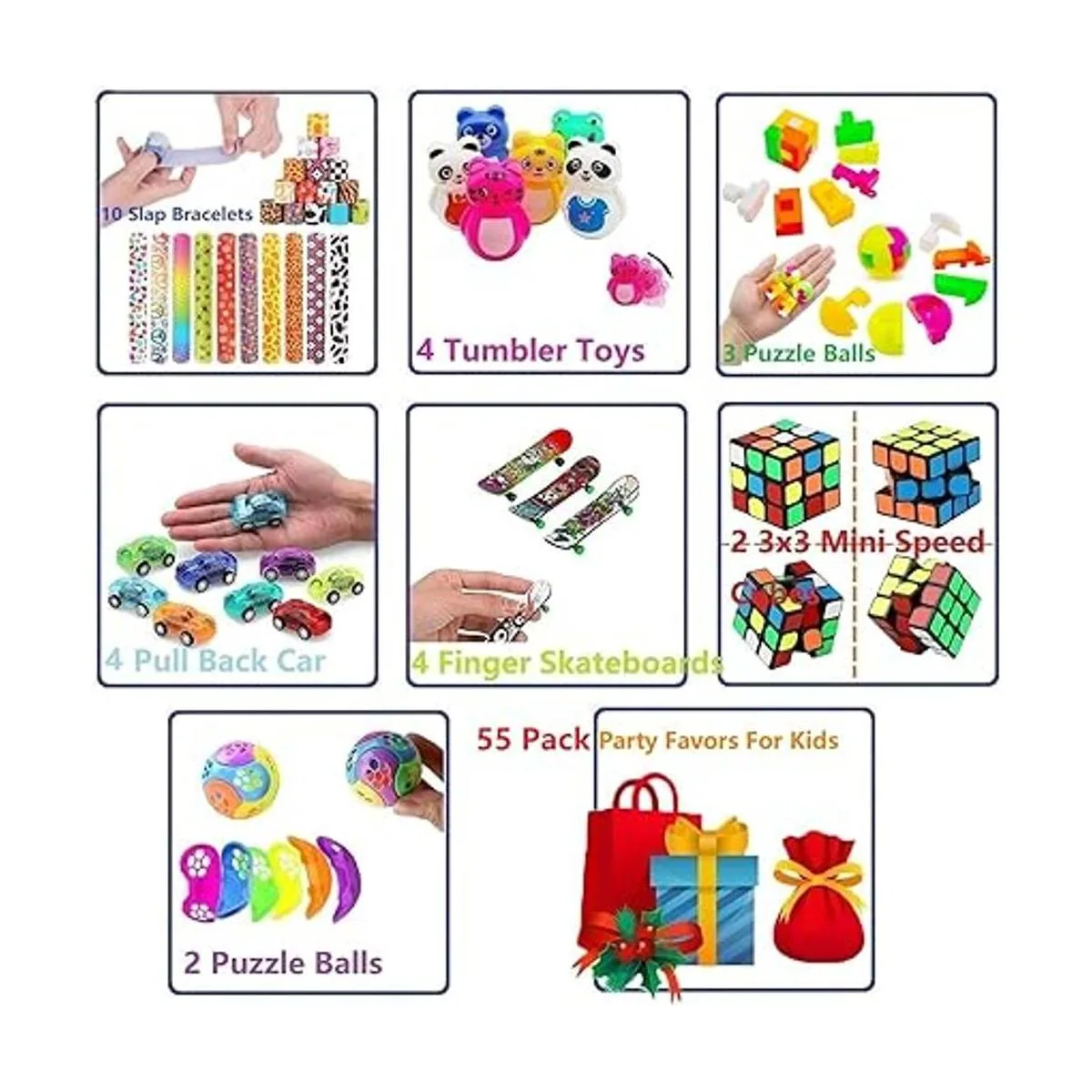 Paquete de 55 juguetes de fiesta para regalos: 10 pulseras de bofetada, 5 juguetes esponjosos Mochi, 5 manos adhesivas, 4 juguetes de vaso, 5 bolas de rompecabezas, 4 patinetas de dedos, 2 mini cubos de velocidad de 3 x 3, 4 rompecabezas de laberinto, 4 coches de tracción, 4 spinners de dedos, 8 babas esponjosas. Total de 52 juguetes de premios.