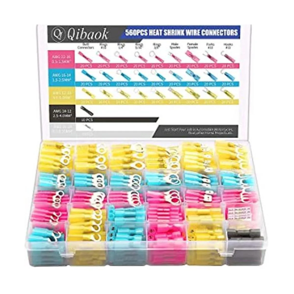 560 conectores termoretráctiles Qibaok kit de conectores eléctricos de cobre impermeable para automóviles marinos de calibre 1614, 2216, calibre 1210, anillo aislado, gancho de horquilla, pala, empalmes de tope