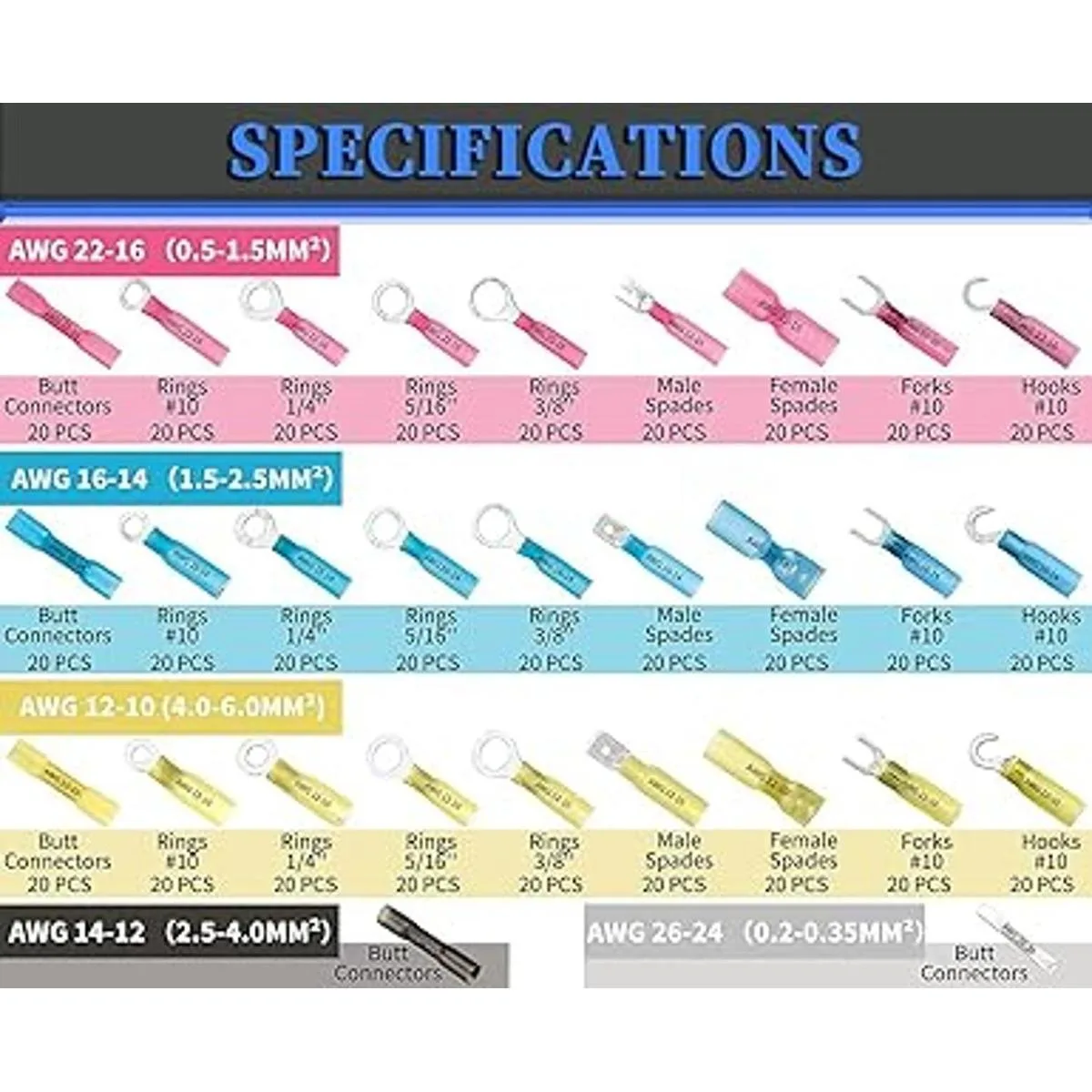 Terminales multifarios: todos los kits de aplicación incluyen conectores AWG1210, 1412, 1614, 2216, 2622, anillo, horquilla, gancho, macho y hembra de desconexión rápida. Diferentes tubos codificados por colores con impresión de calibre de alambre que proporciona una fácil identificación.