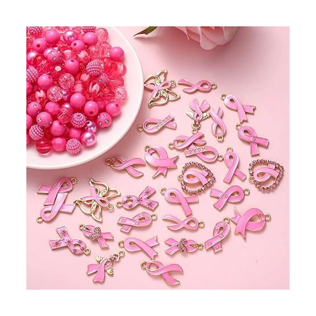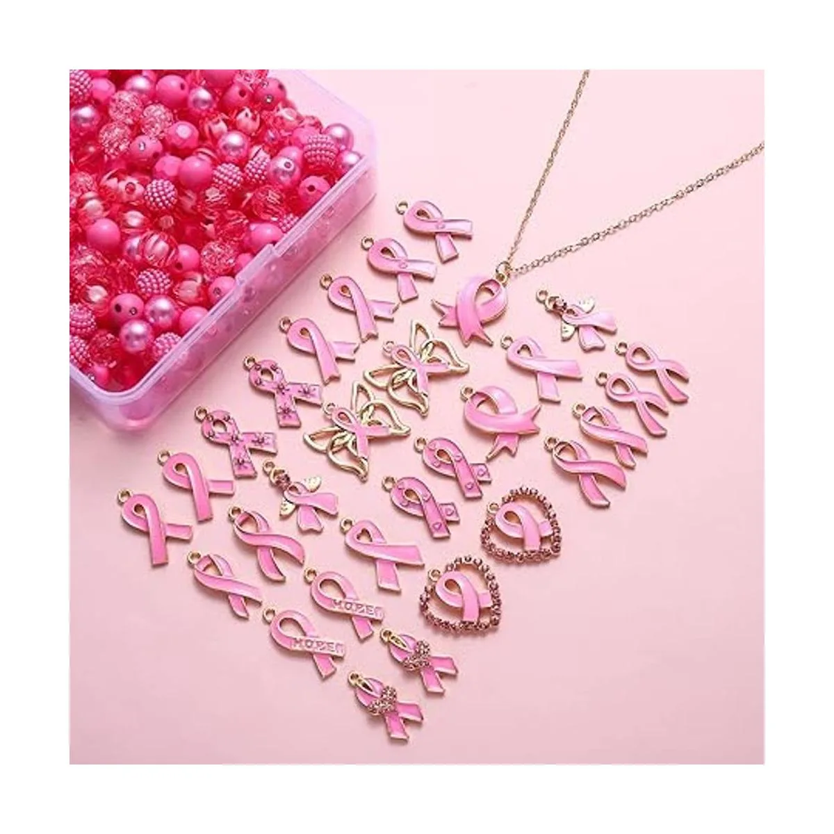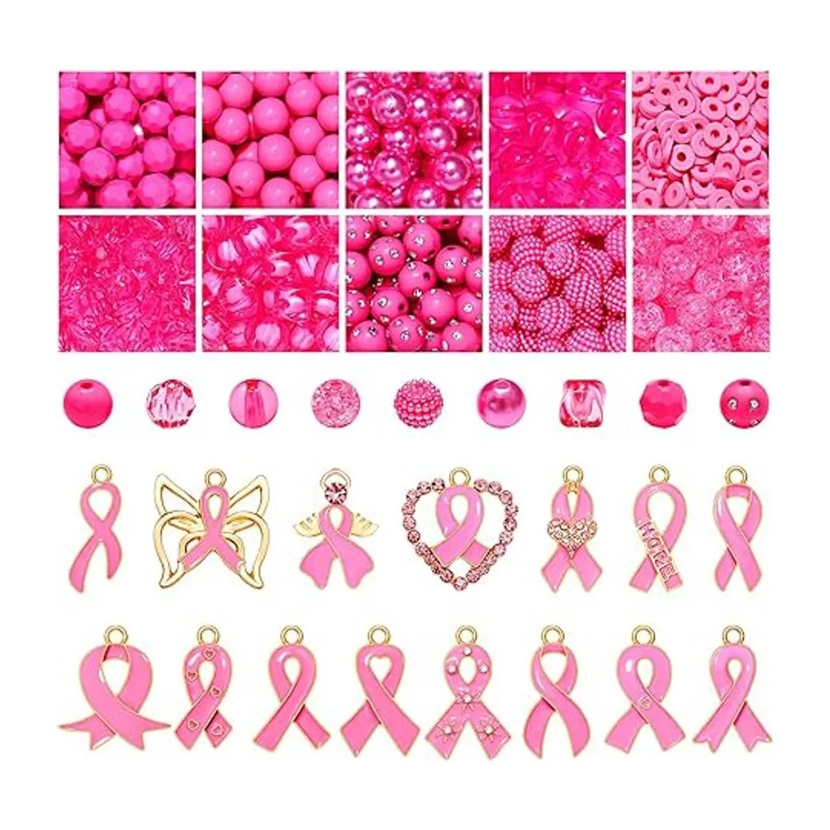 570 cuentas de concienciación sobre el cáncer de mama para hacer joyas, abalorios de cinta rosa, cuentas de arcilla de cristal acrílico rosa para pulseras, collares, aretes, manualidades de bricolaje 570 cuentas y encantos