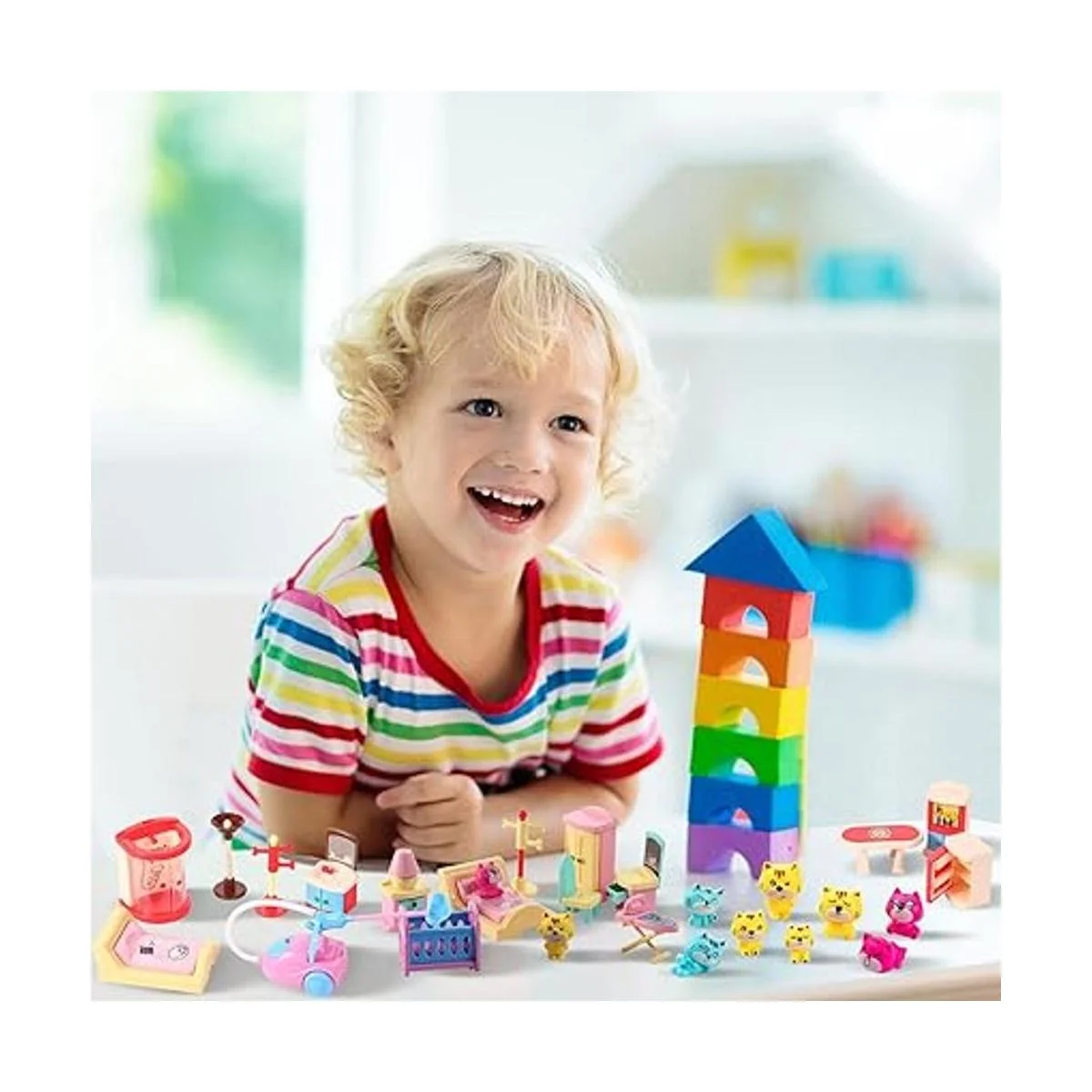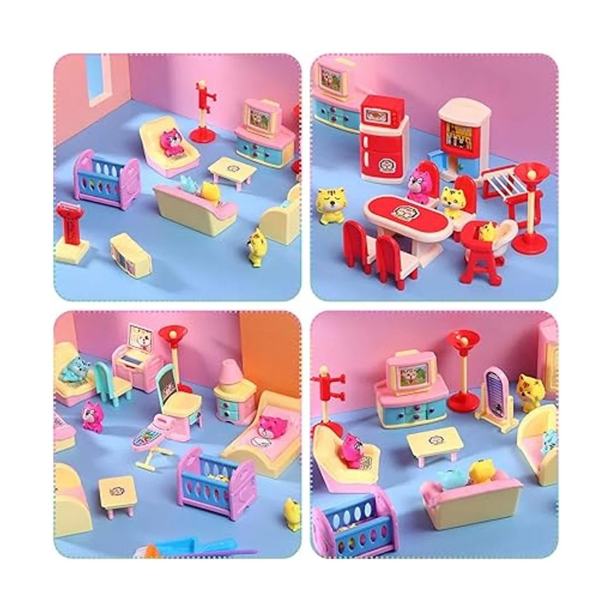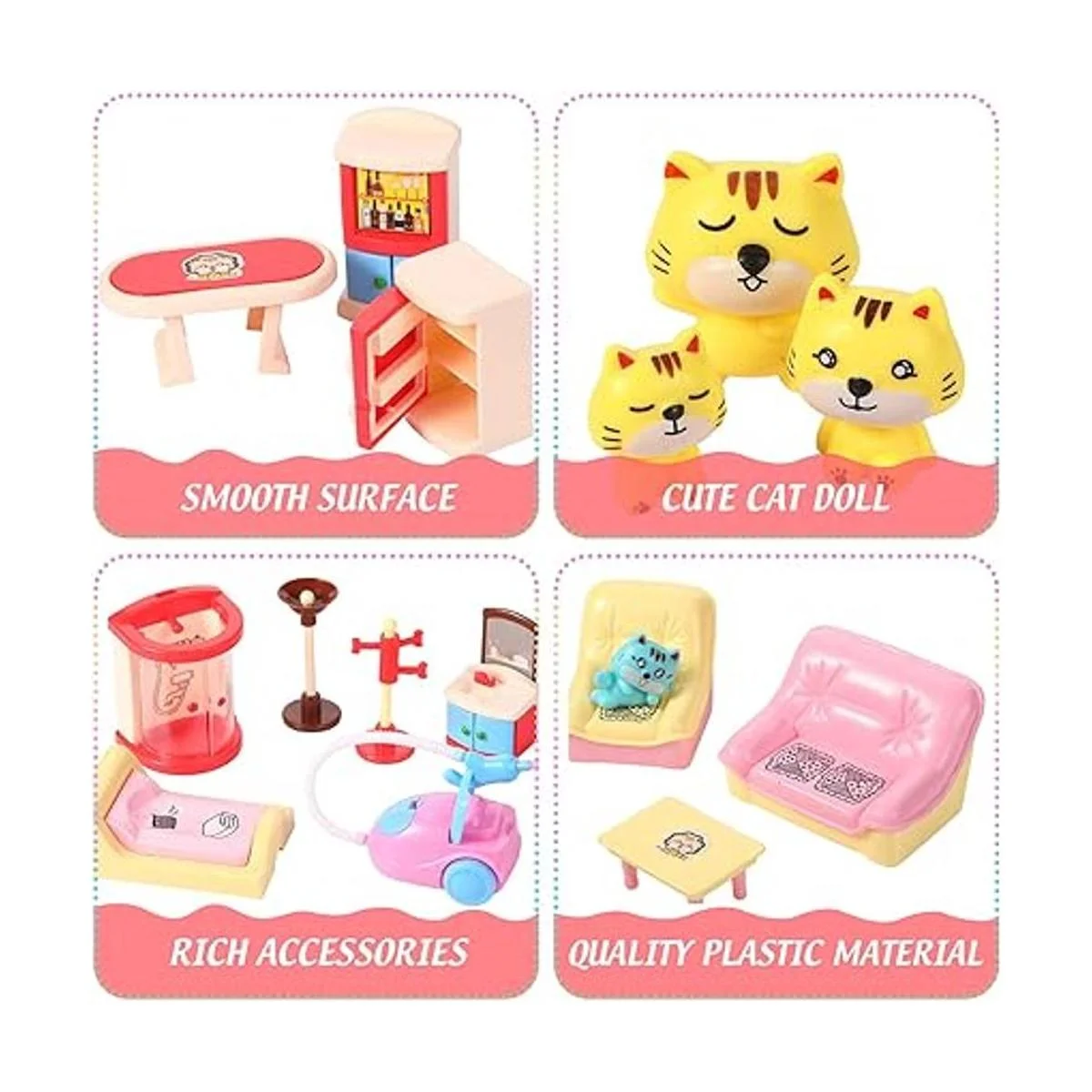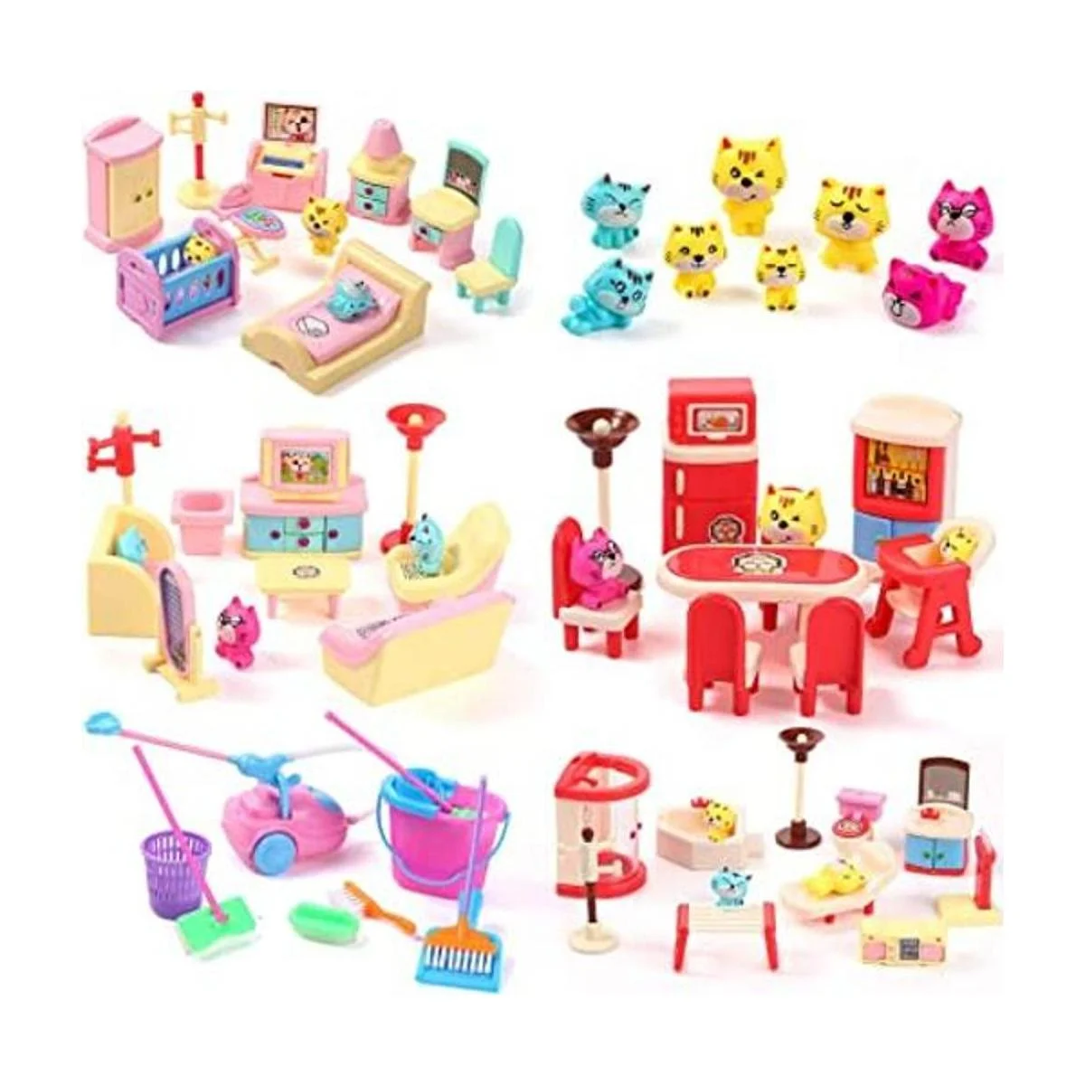 Divertido kit de accesorios para casa de muñecas: recibirás 4 juegos de muebles pequeños para casa de muñecas, incluyendo baño, dormitorio, sala de estar y comedor, 8 bonitas figuras de gato y un juego de kit de limpieza de casa de muñecas, que son buenas combinaciones para que tus chicos hagan juegos de simulación y se diviertan mucho