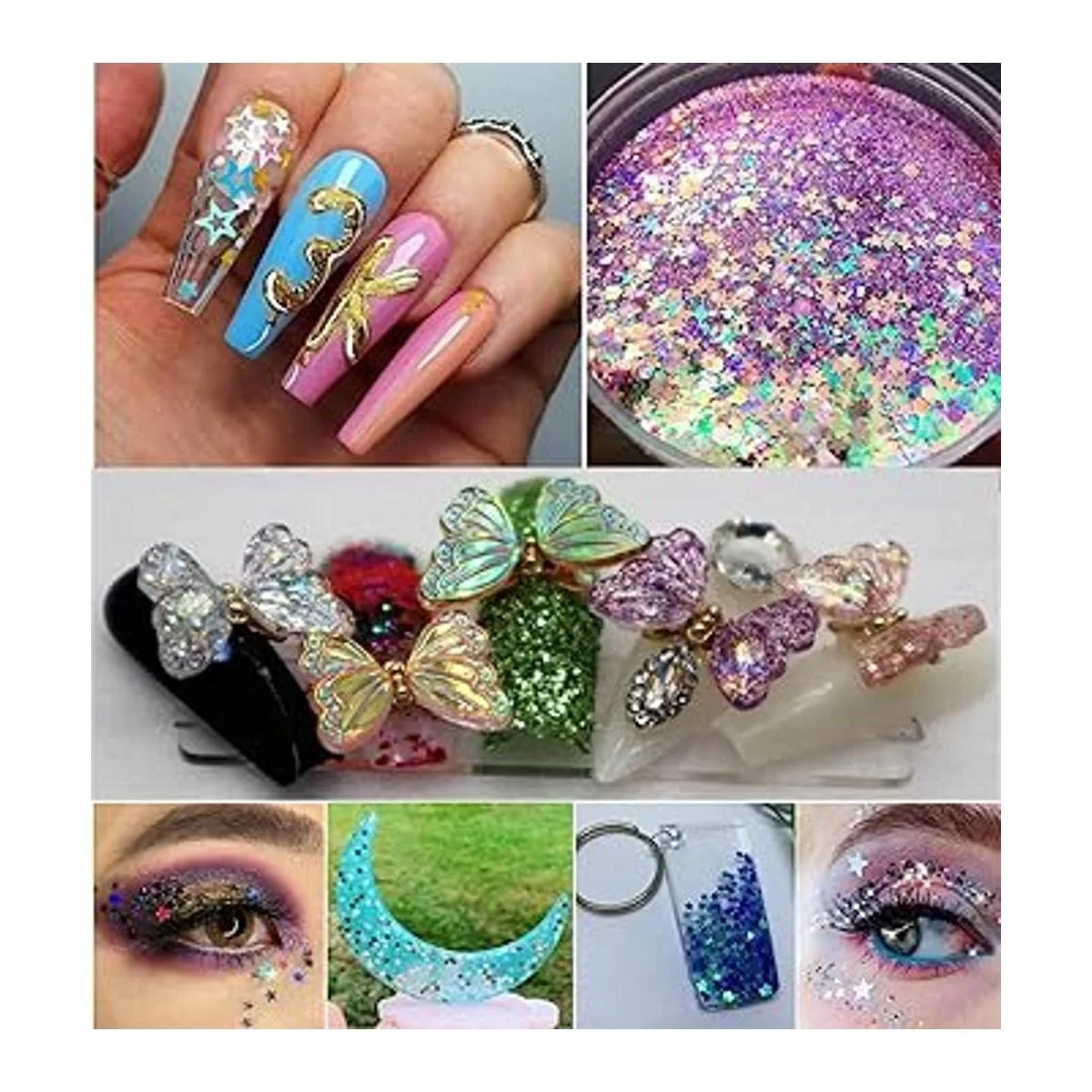 Amplias aplicaciones: las purpurinas gruesas se pueden utilizar para crear joyas de resina, llaveros de resina, vasos de resina epoxi, adornos de resina, pinturas, decoraciones del hogar, batidos, ideal para hacer slime, tarjetas de felicitación, esmalte de uñas, brillo de labios, etc. Brillo perfecto para arte de uñas acrílicas, maquillaje rave de belleza, pintura corporal.