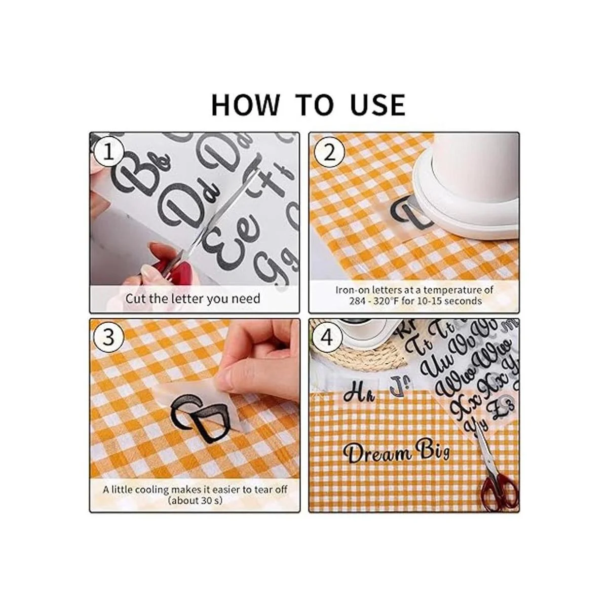 Cantidad suficiente: recibirás 6 hojas de letras para planchar en 208 piezas en total, incluyendo 104 piezas mayúsculas 1.4 pulgadas y 104 piezas minúsculas 0.75 pulgadas, y cada hoja mide aproximadamente 10.6 x 7.1 in, suficiente para que puedas aplicar y satisfacer tus diferentes necesidades de bricolaje