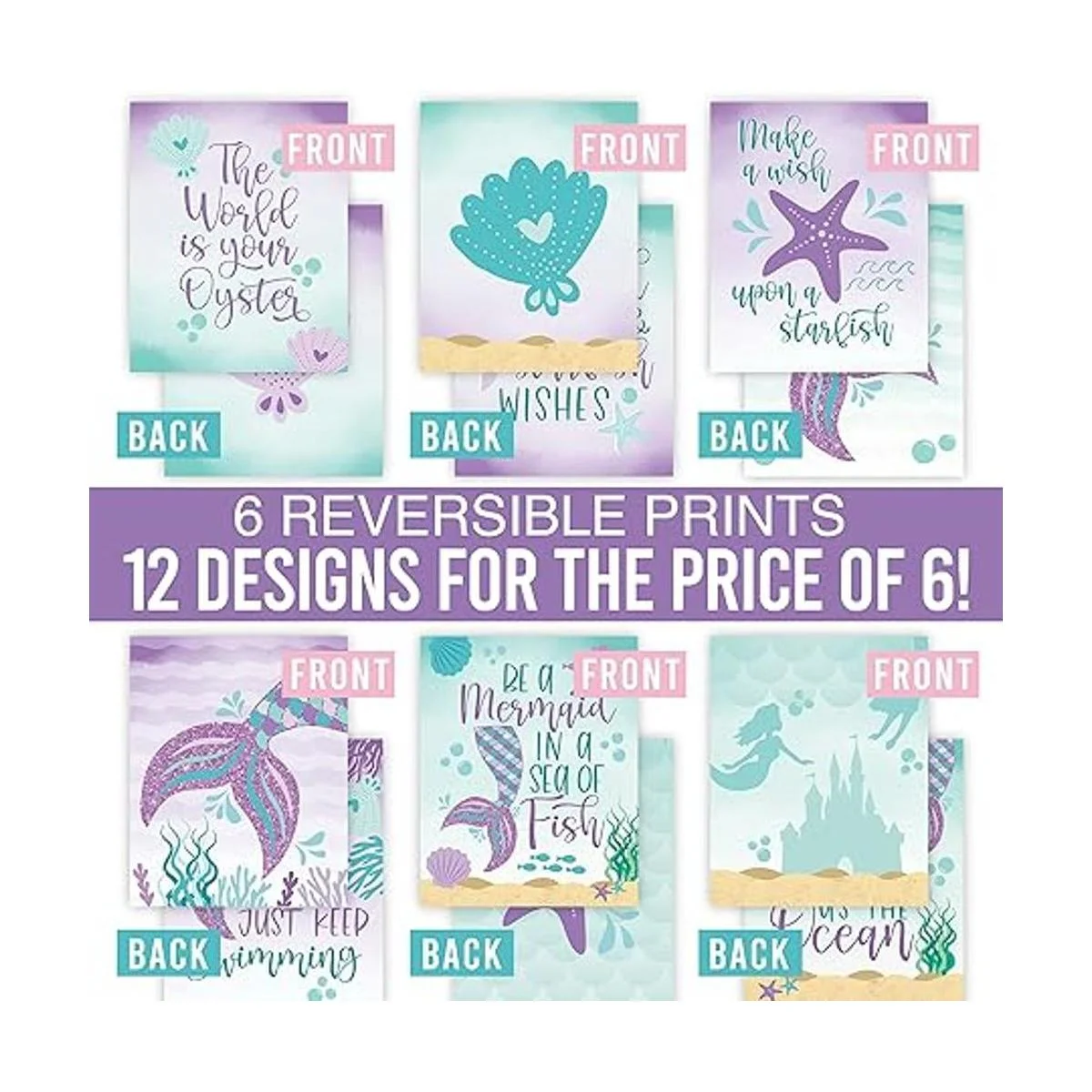 Recibirás 6 impresiones reversibles de 8 x 10 pulgadas sin marco; ya que están impresas de doble cara, tendrás un total de 12 diseños únicos diferentes; son una gran decoración de sirena para baby shower o fiesta de cumpleaños de sirena; impresiona a amigos y familiares con decoraciones de fiesta de sirena