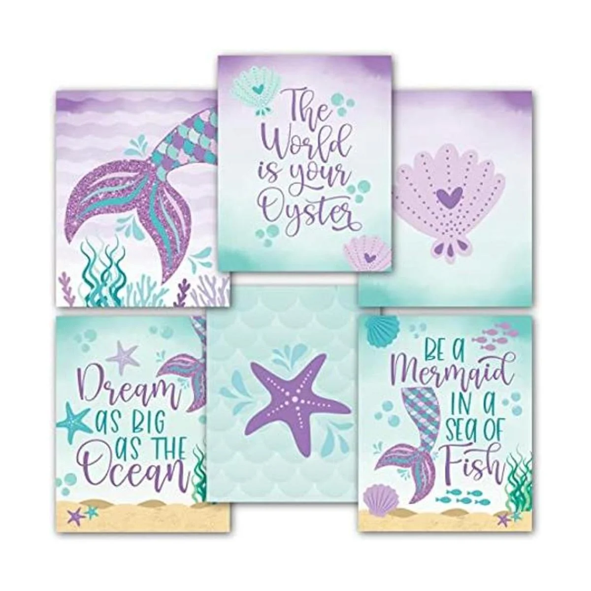 6 impresiones reversibles de sirena de 8 x 10 pulgadas, suministros de fiesta de cumpleaños de sirena, decoraciones de cumpleaños de sirena, decoraciones debajo del mar para carteles de dormitorio de niñas, decoración de baño de sirena, impresiones artísticas de pared