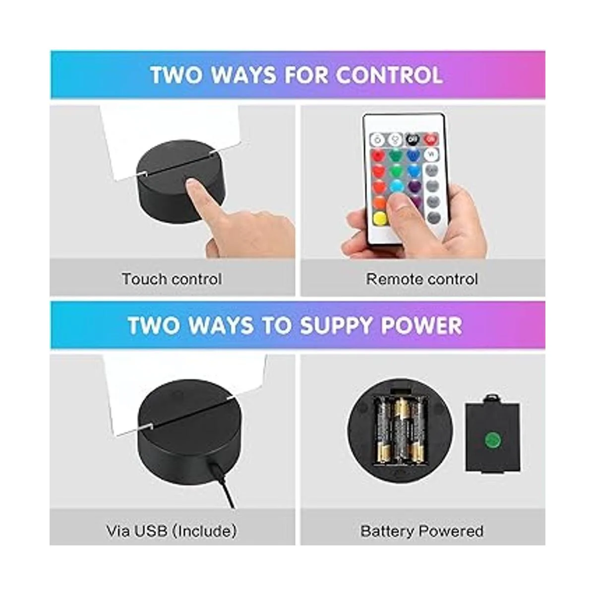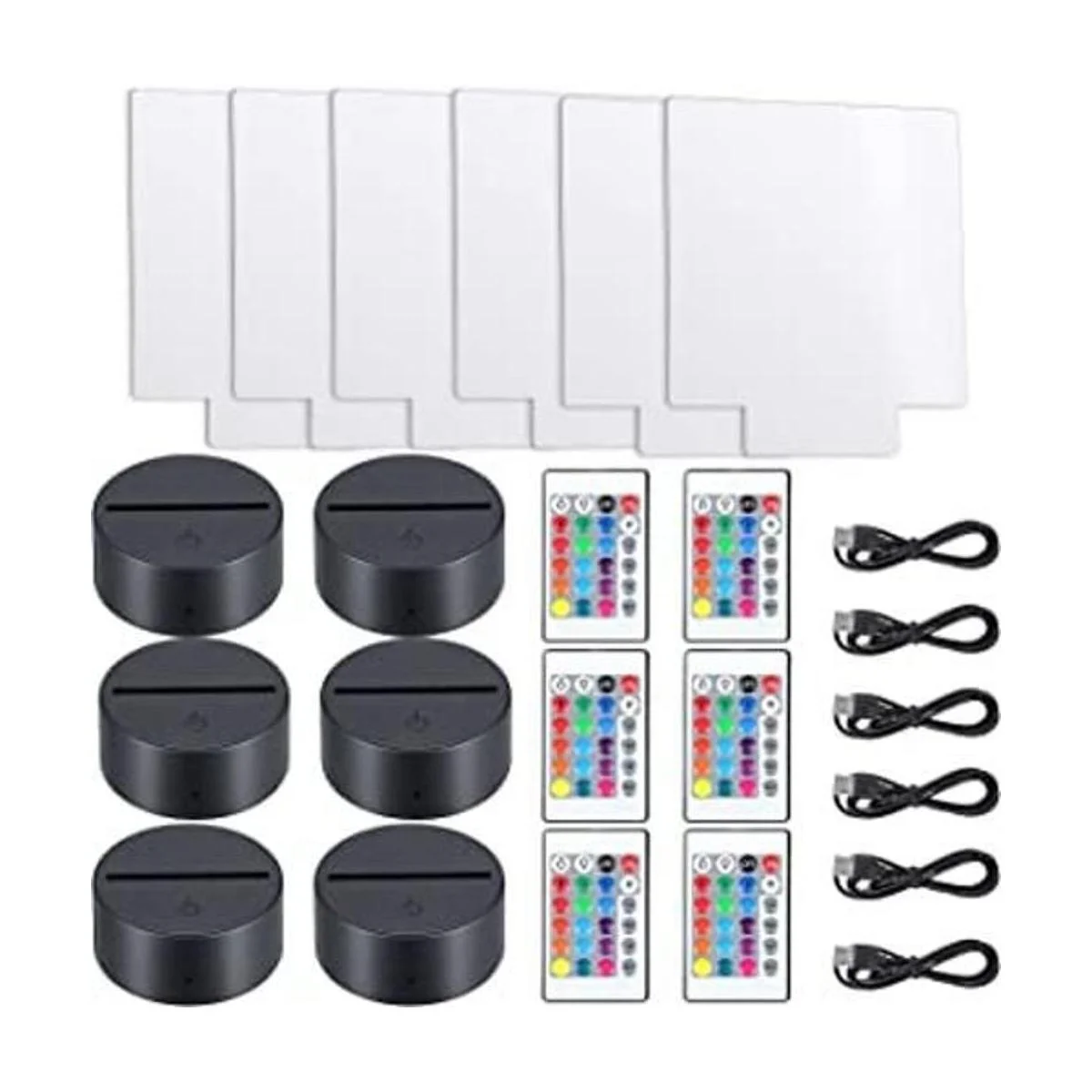 Lo que recibes: el paquete viene con 6 juegos de bases de lámpara LED de noche 3D, incluyendo 6 piezas de hojas acrílicas transparentes, 6 soportes de lámpara LED de noche 3D, 6 cables de carga y 6 mandos a distancia, cantidad suficiente para tus necesidades diarias de reemplazo y compartir