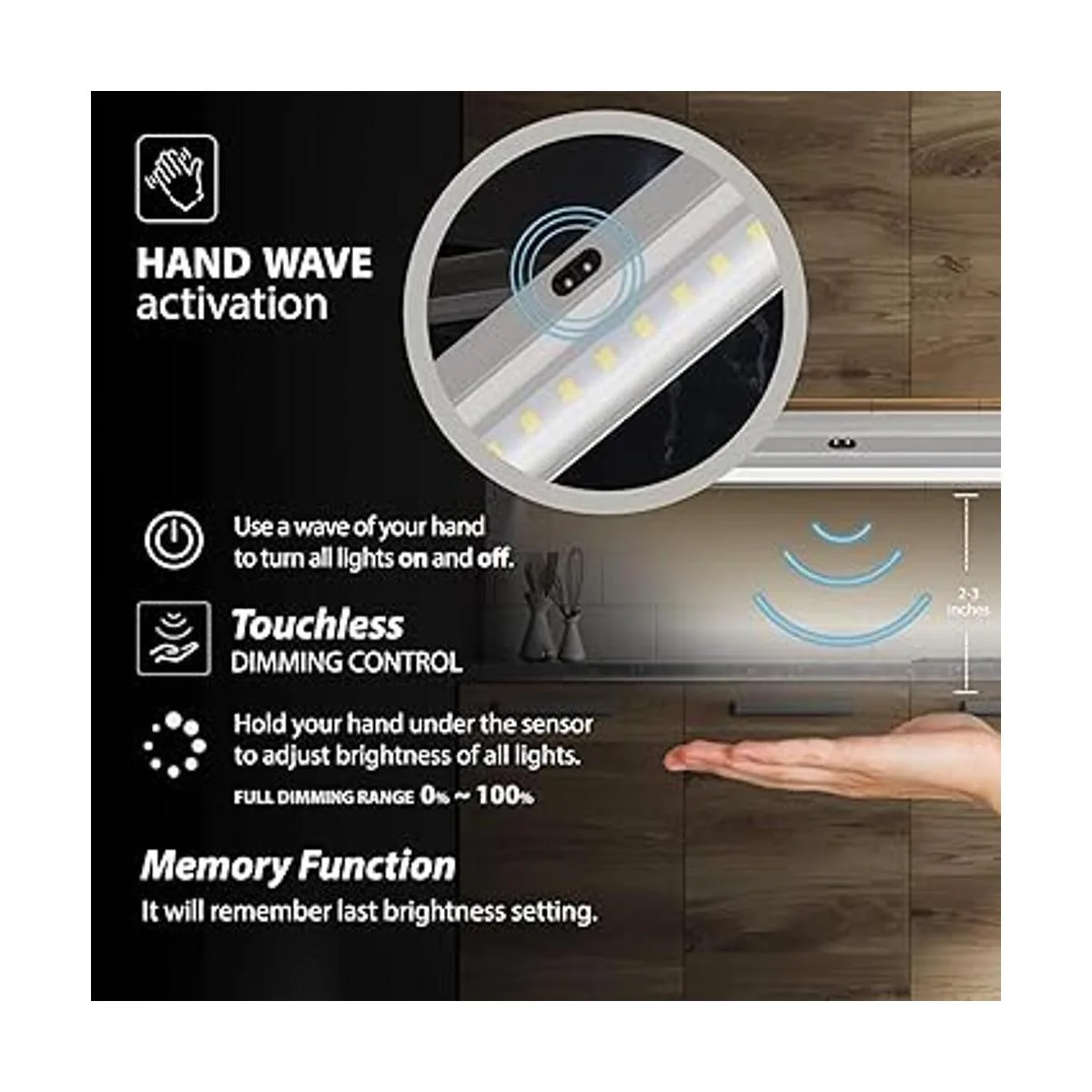 Activado por ondas de mano El sensor IR sensible de nuestras luces debajo del armario se enciende y apaga con una simple onda. Ideal para días ocupados en la cocina. Sin molestos controles remotos que se ensucian y te molestan mientras trabajas.