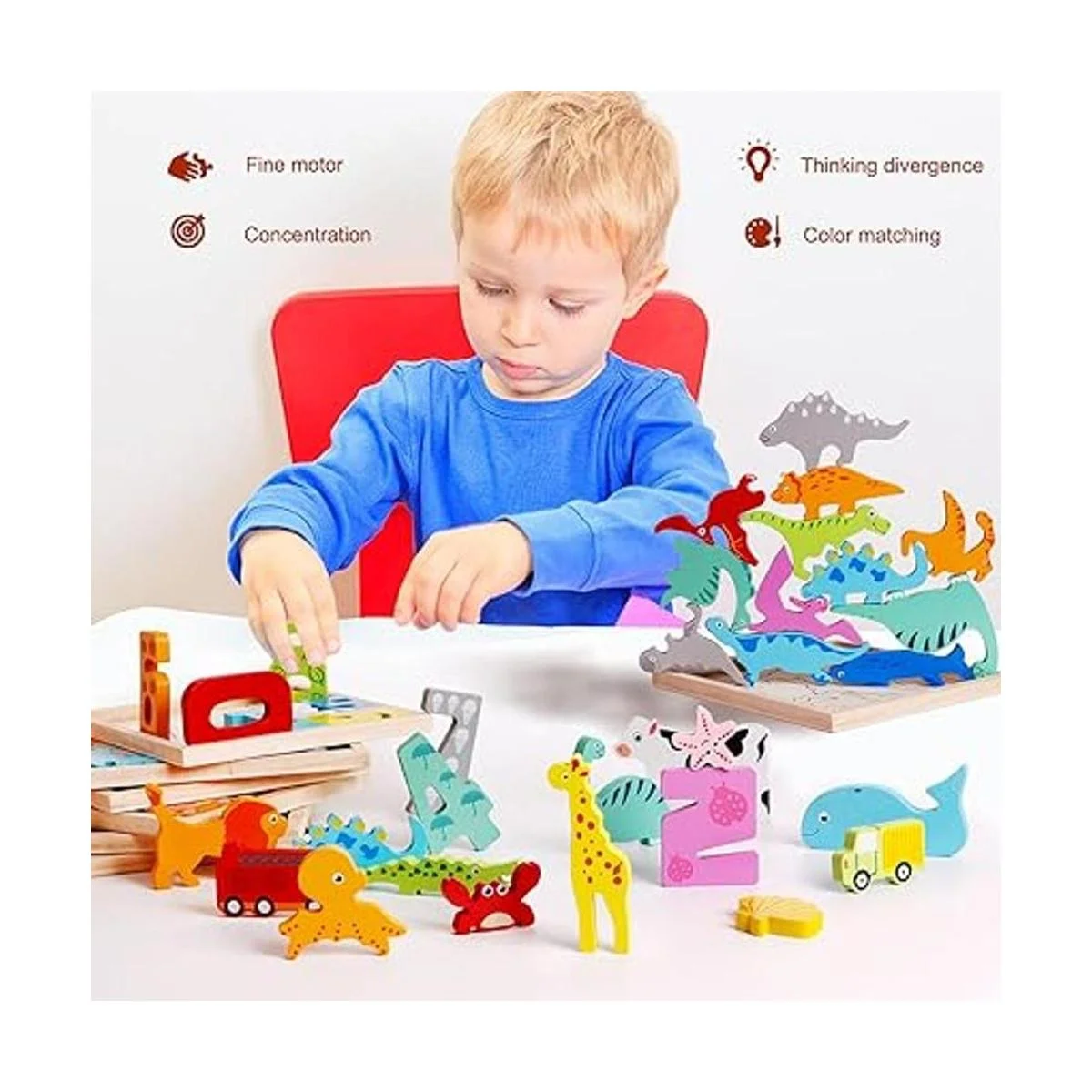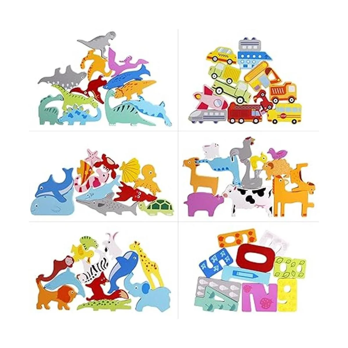 6 paquetes de vehículos con números de animales, juguetes de clasificación y apilamiento de dinosaurios, bloques de madera y rompecabezas para niños y niñas de 3, 4, 5 años, cumpleaños, vacaciones, regalos Montessori, juguetes para niños pequeños