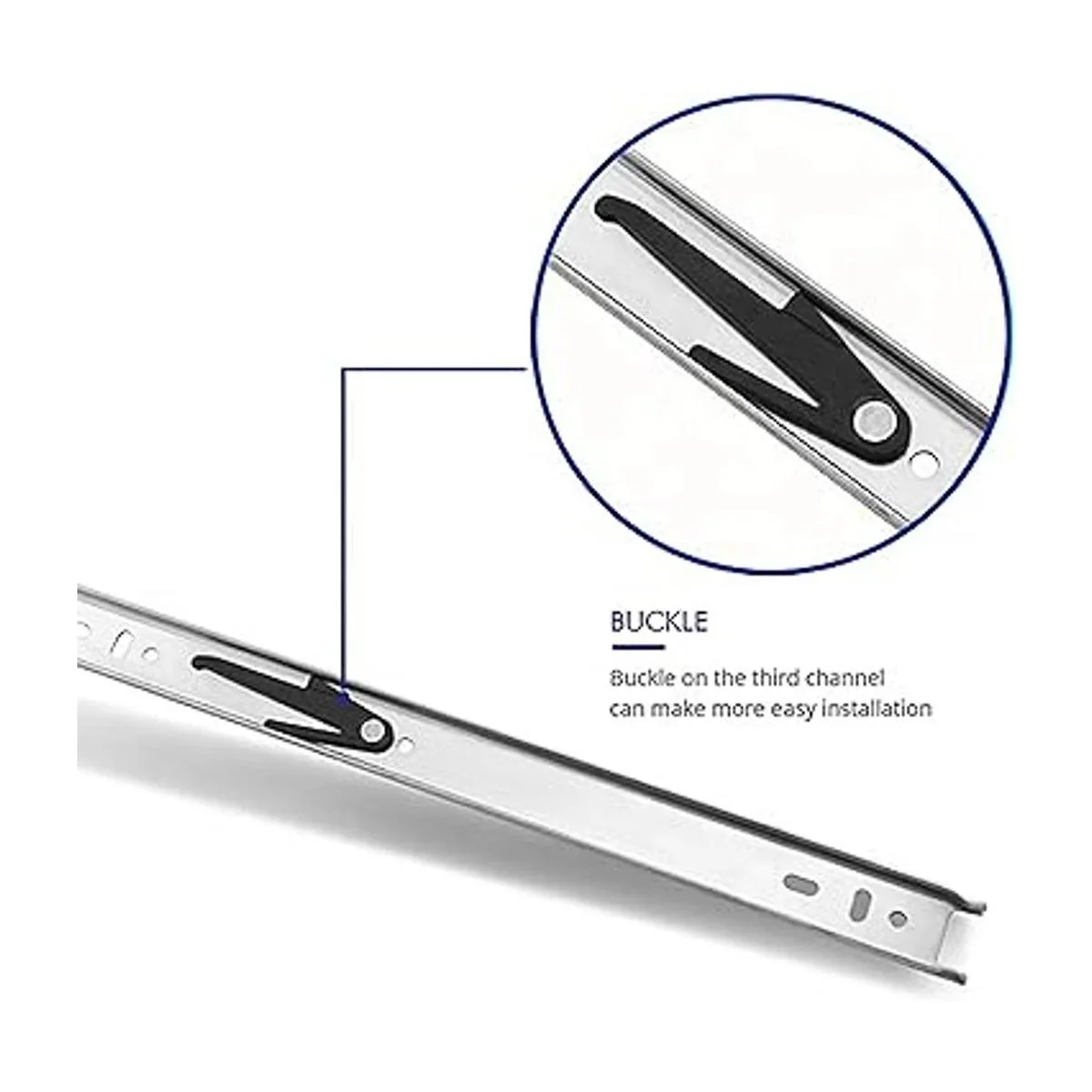 Guía para elegir el tamaño de las guías de cajón: para determinar qué tamaño de las guías son buenas para tu cajón, mide la longitud del cajón sin el marco. Y si la longitud no es uniforme, elige 1.0 in más corta. La longitud de las diapositivas no puede ser más larga que la profundidad de la caja del gabinete. Y los gabinetes del marco frontal requerirán un soporte de montaje trasero, mientras que para armarios sin cara las diapositivas se montan directamente en el lateral.