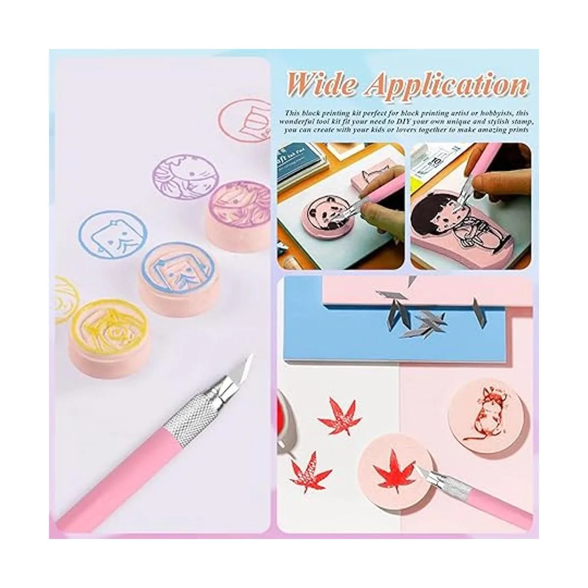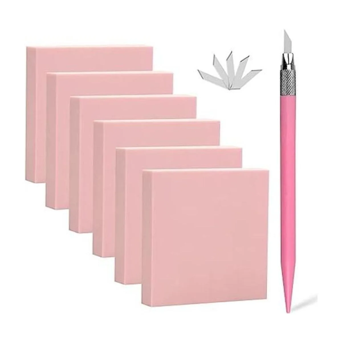 6 bloques de tallado de goma con kit de herramientas de cortador: 6 bloques de tallado de goma rosa, 1 cuchillo de tallado incluye 5 cuchillas de tallado para hacer tu propio sello de goma. 2 x 2 pulgadas de tamaño y 0.4 pulgadas de grosor. Tallado más fácil que los bloques de linóleo.