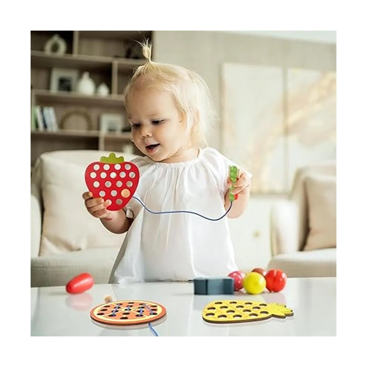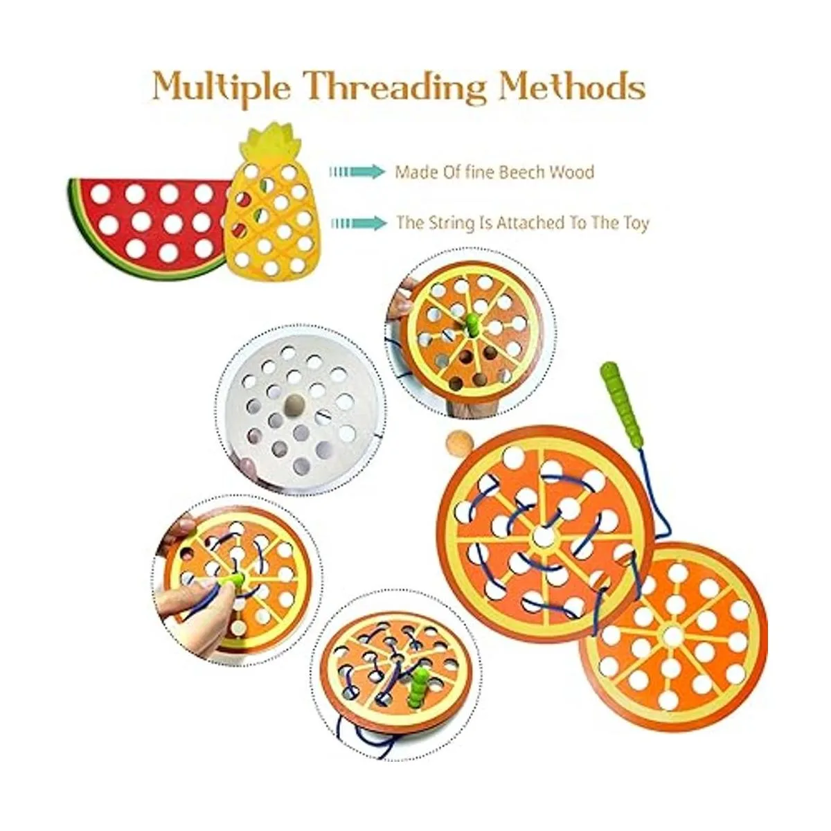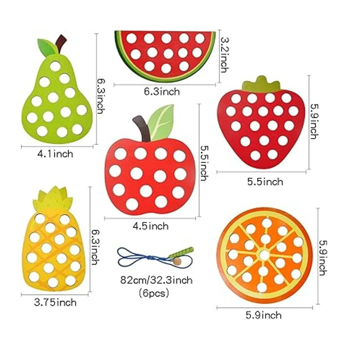 Juguetes de frutas con cordones de madera: el juego de juguetes de cordones incluye 6 cuerdas de cordones y 6 frutas diferentes en rodajas: manzana, sandía, piña, fresa, piña, pera. Estos juguetes de hilo de madera ayudan a desarrollar la imaginación de los niños, la coordinación ojomano, las habilidades motoras finas, cognitivas y de percepción visual