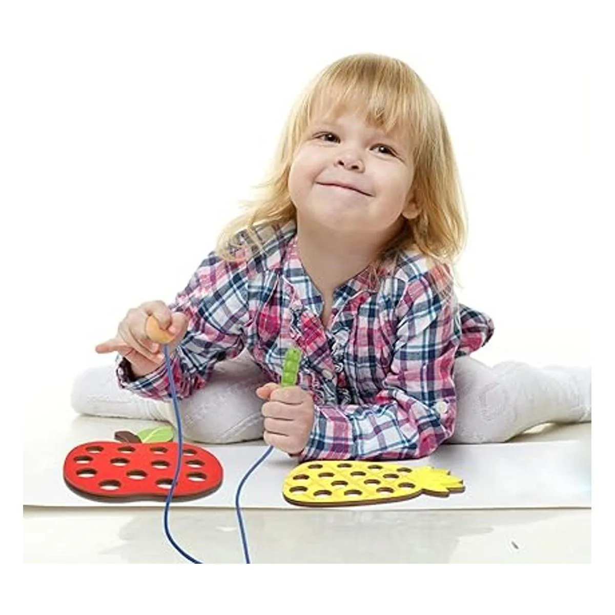 6 piezas Juguete de cordones para niños pequeños, juguetes de enhebrado de madera, actividad Montessori educativa y de aprendizaje para bebés y niños, juguetes de habilidad motora fina, manzana pera, fresa, sandía, naranja y piña