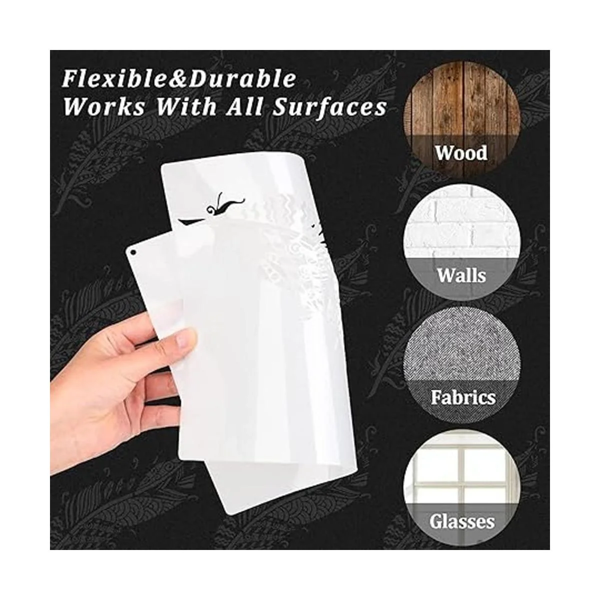 Cómodo de usar: cada plantilla de pared de plumas tiene el intervalo de la pluma, puedes utilizar pulverización de pintura para rociar el diseño en los lugares que desees, lo que es conveniente para ti, y hay un agujero redondo en la parte superior de cada plantilla, puedes poner plantillas de plumas juntas con el anillo de apertura de metal cuando no necesites usar, puede ahorrar espacio