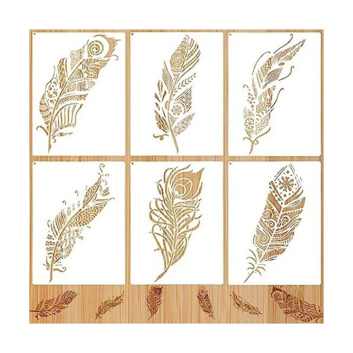 6 plantillas decorativas de plumas de mandala, hermosa plantilla de plumas de mandala, plantilla de pintura reutilizable y anillo abierto de metal para pintar sobre decoración de pared de madera