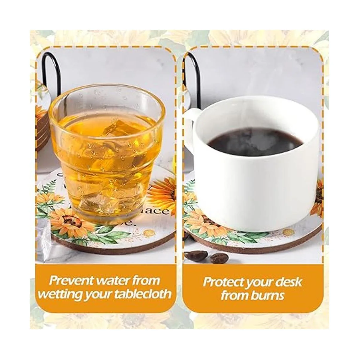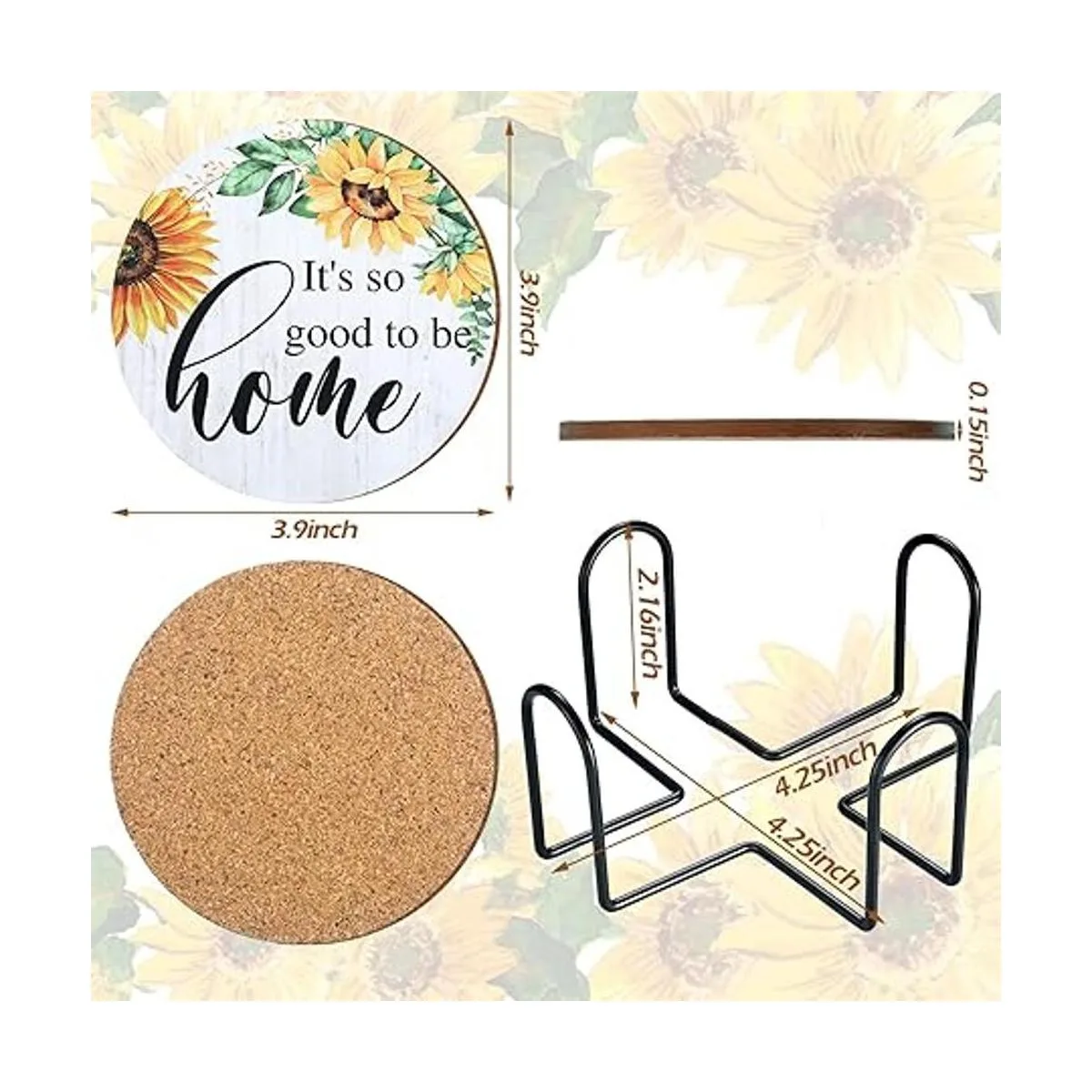 Detalles del tamaño: el tamaño del posavasos de girasol es de aproximadamente 3.9 x 3.9 x 0.15 pulgadas, y el soporte es de aprox. 4.25 x 4.25 x 2.16 pulgadas, estos posavasos con estampado de girasol son lo suficientemente grandes y suaves como para adaptarse a la mayoría de bebidas, y la parte inferior hecha de corcho no raya tus hermosos muebles de madera, adecuados para fiestas