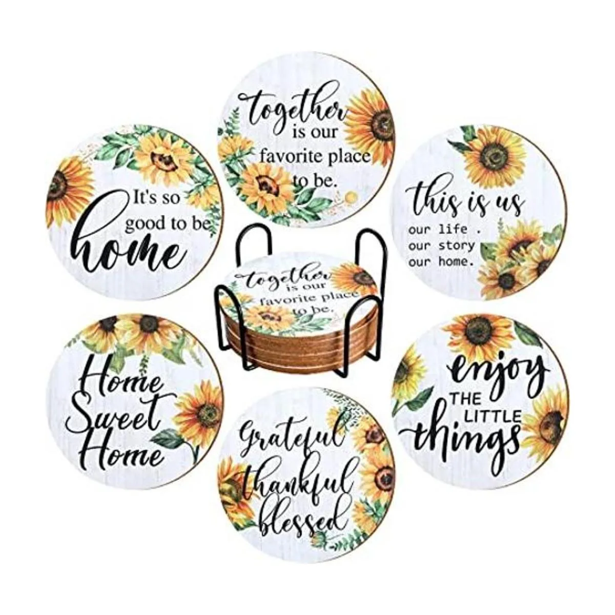 El paquete contiene: recibirás 6 posavasos de girasol impresos con diferentes palabras y un soporte de metal, cada frase en el posavasos representa un significado diferente pero positivo; las suficientes cantidades y estilos pueden satisfacer tus necesidades en la vida cotidiana, y también se pueden aplicar como regalo para enviar a otros