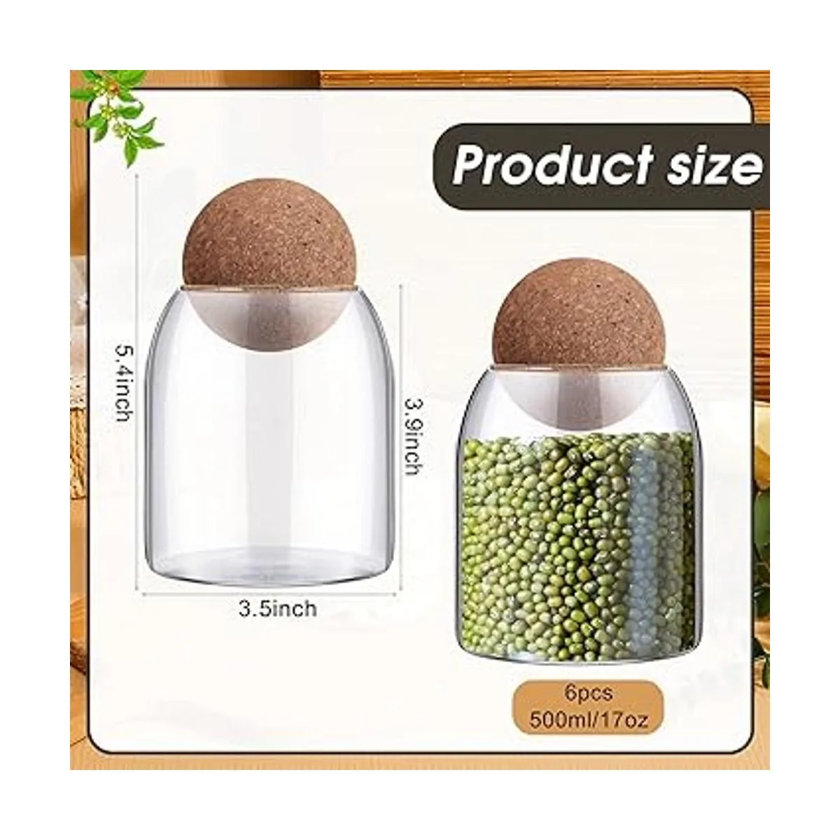 6 recipientes de almacenamiento de vidrio de 16.9 fl oz de 17 onzas con bola redonda de corcho sellado, lindo organizador decorativo, frascos de vidrio con tapa de madera hermética, soporte de punta Q para alimentos, café, caramelo, nueces, baño