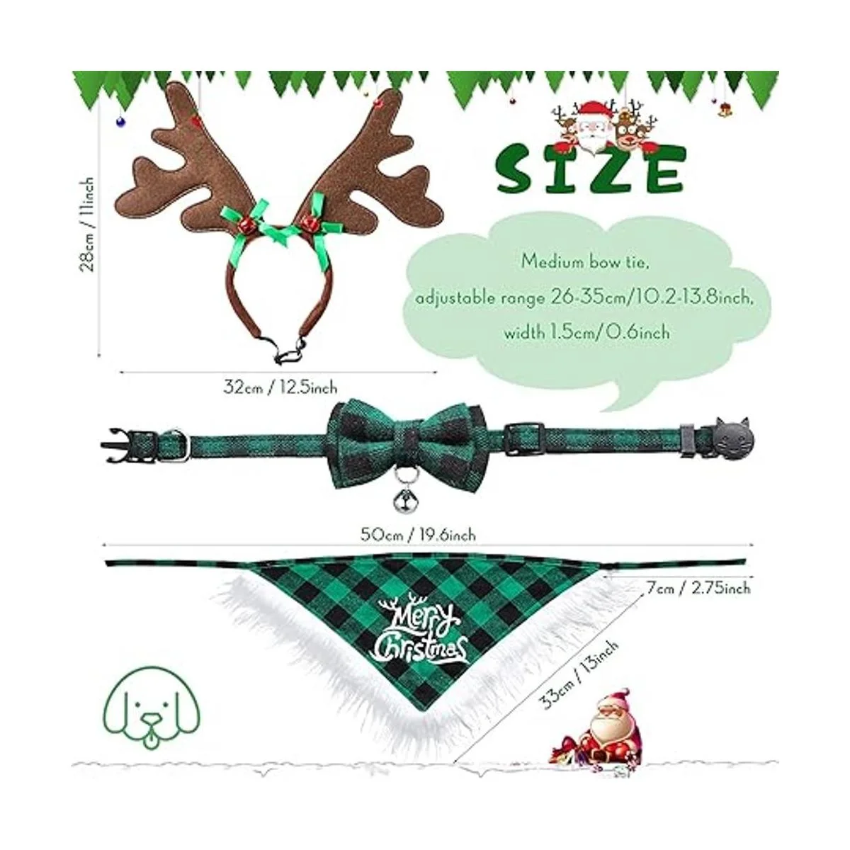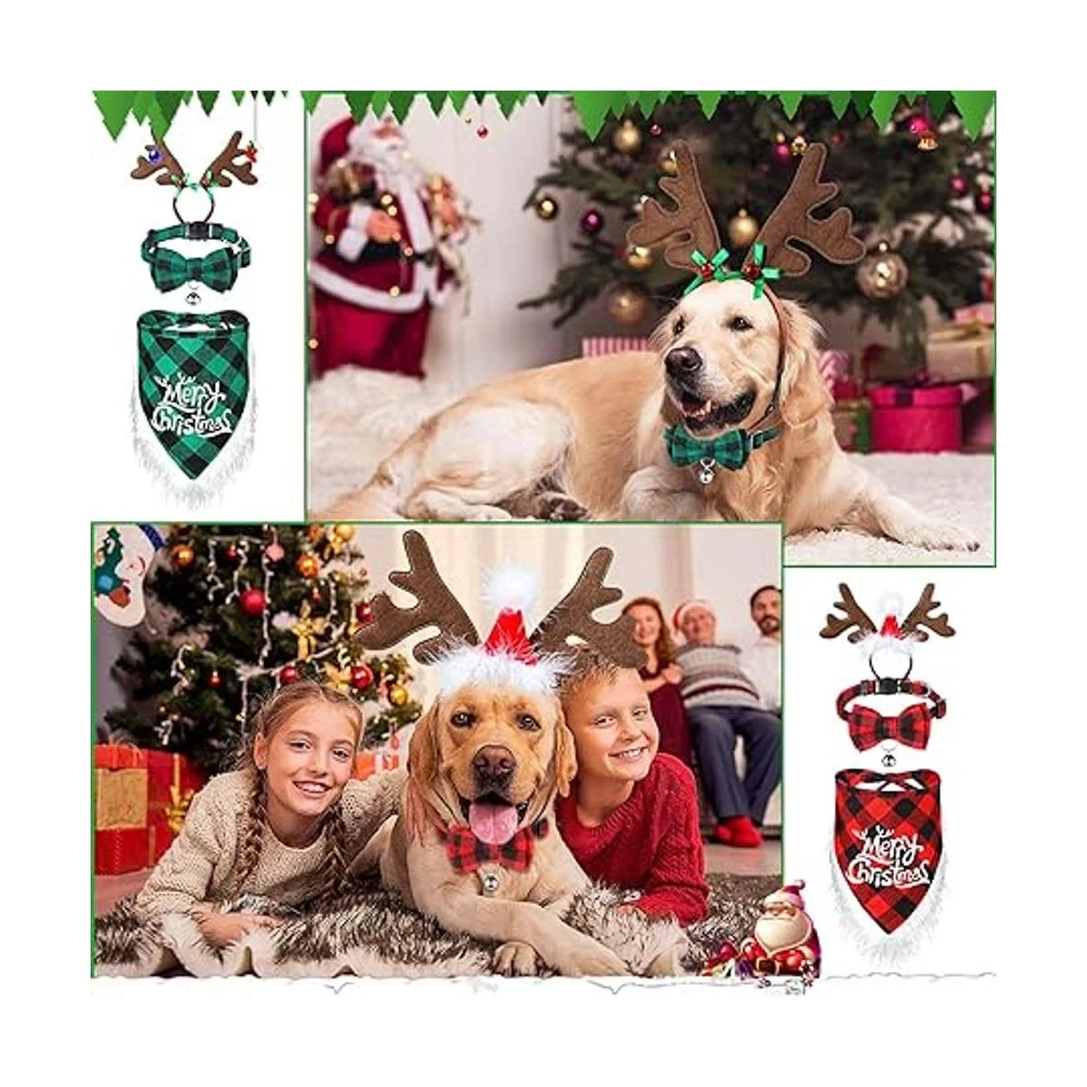 Disfraces para mascotas con temática navideña: el pañuelo para mascotas, pajarita y diadema están diseñados en estilo navideño con patrones clásicos de cuadros y forma de cuerno, que se ven festivas y hermosas, añadiendo un ambiente más encantador a tu fiesta de Navidad
