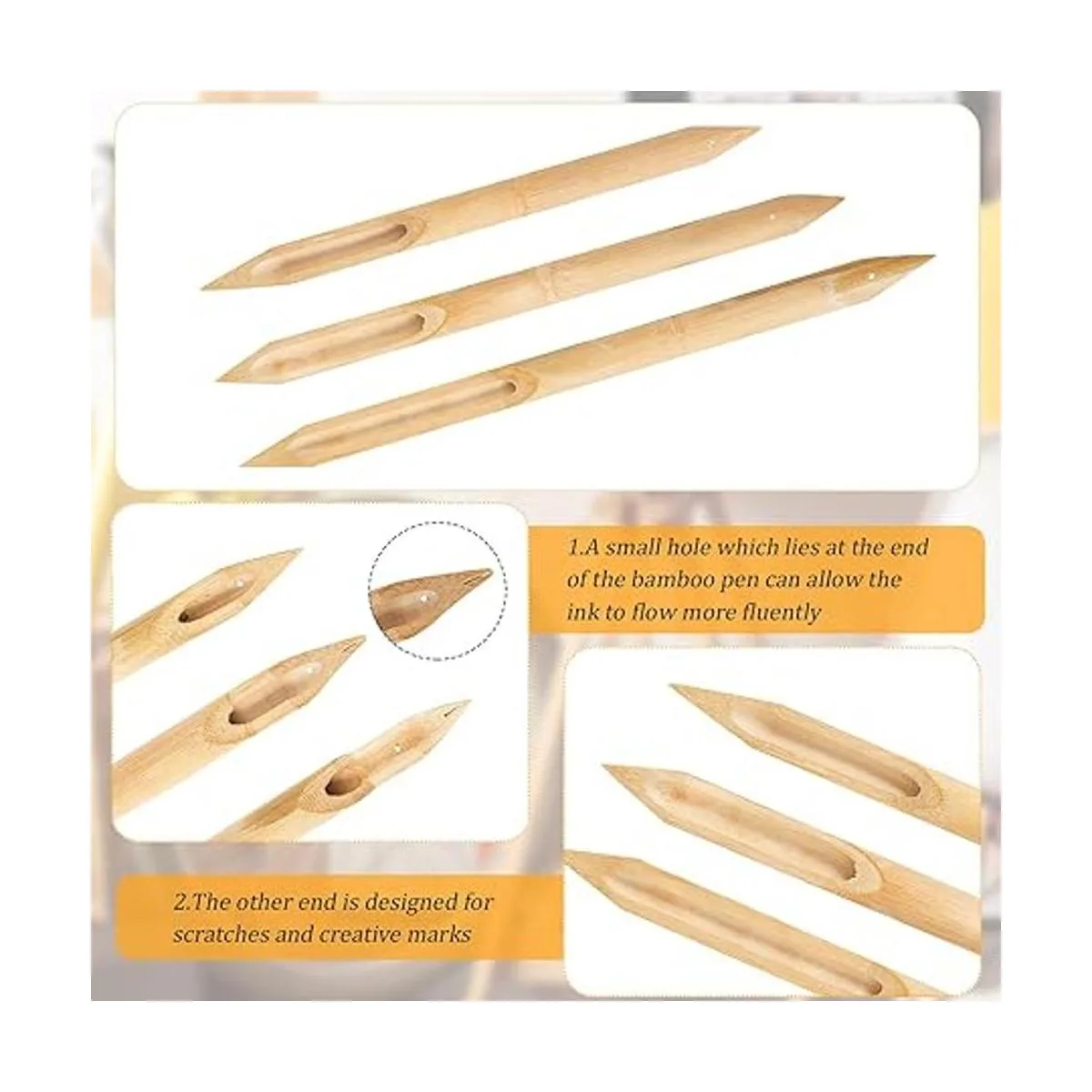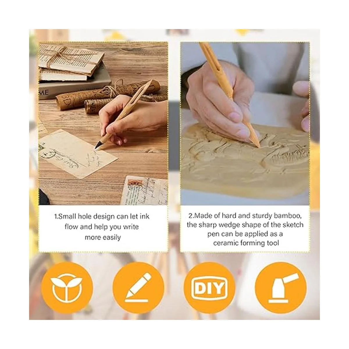 Diseño de doble cabeza: el bolígrafo de bambú hecho a mano está diseñado con doble cabeza, un pequeño agujero en un extremo para permitir que la tinta fluya, y el otro extremo se puede aplicar para tallar y dar forma a arcilla, adecuado para crear arañazos y diferentes marcas