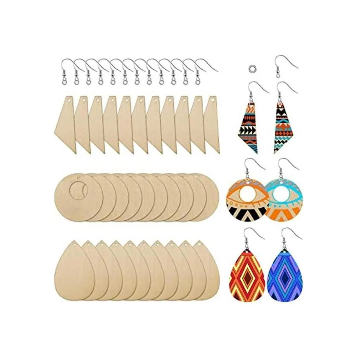 60 aretes de madera sin acabar, lágrima en blanco y colgantes con corte cónico con 60 ganchos para aretes y 60 anillos para saltar para manualidades, joyería