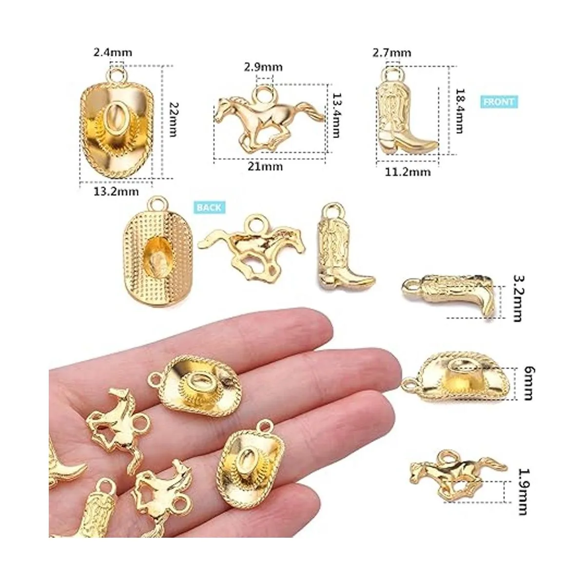 Información sobre el tamaño: el tamaño de la bota de vaquero es de 0.724 in x 0.441 in, el agujero: 0.106 in, el sombrero de vaquero es de 0.866 in x 0.520 in, agujero: 0.094 in, el caballo es de 0.827 in x 0.563 in, el agujero: 0.114 in