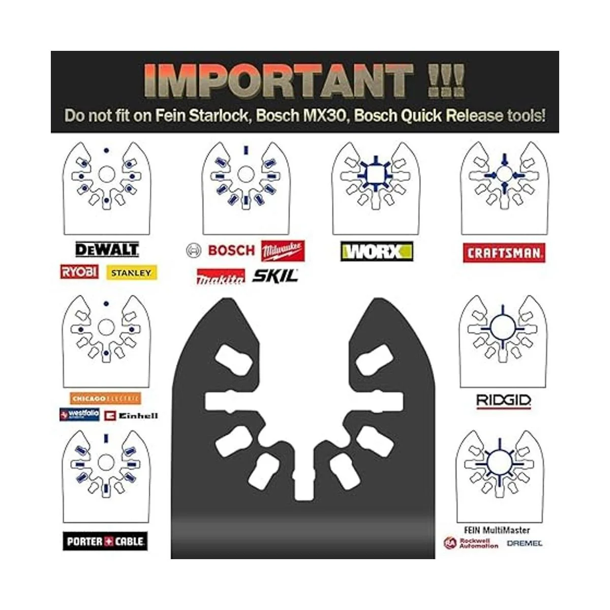 Sistema de interfaz universal de cuchillas de madera multiherramienta: nuestras 60 hojas de sierra de liberación rápida son perfectamente compatibles con más del 95 de las herramientas oscilantes en el mercado, como Fein Multimaster, Ryobi, Milwaukee, Hitachi, Black Decker, Chicago Electric, Dewalt, Craftsman y otros. No es compatible con herramientas Bosch de liberación rápida: no es compatible con Fein Starlock, Bosch MX30; adaptador necesario para Fein Supercut; adaptador necesario para Dremel MM40 y MM45
