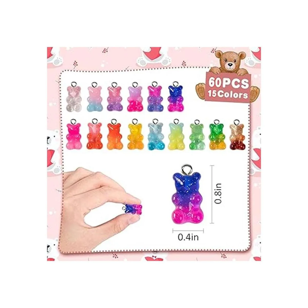 60 dijes de goma en 3D degradados para bricolaje Colgantes de arcilla en forma de oso de resina en 15 colores, aretes de pulsera Nacklace DIY para hacer joyas, colgantes de arte de uñas para niños y adultos, manualidades hechas a mano, Acero inoxidable Metal