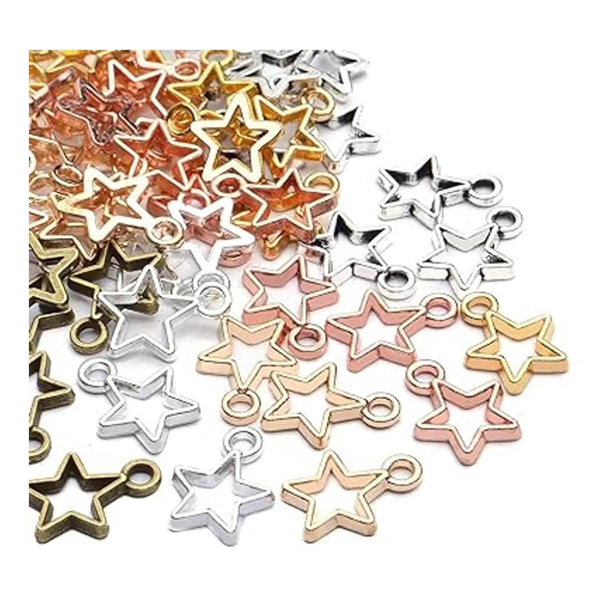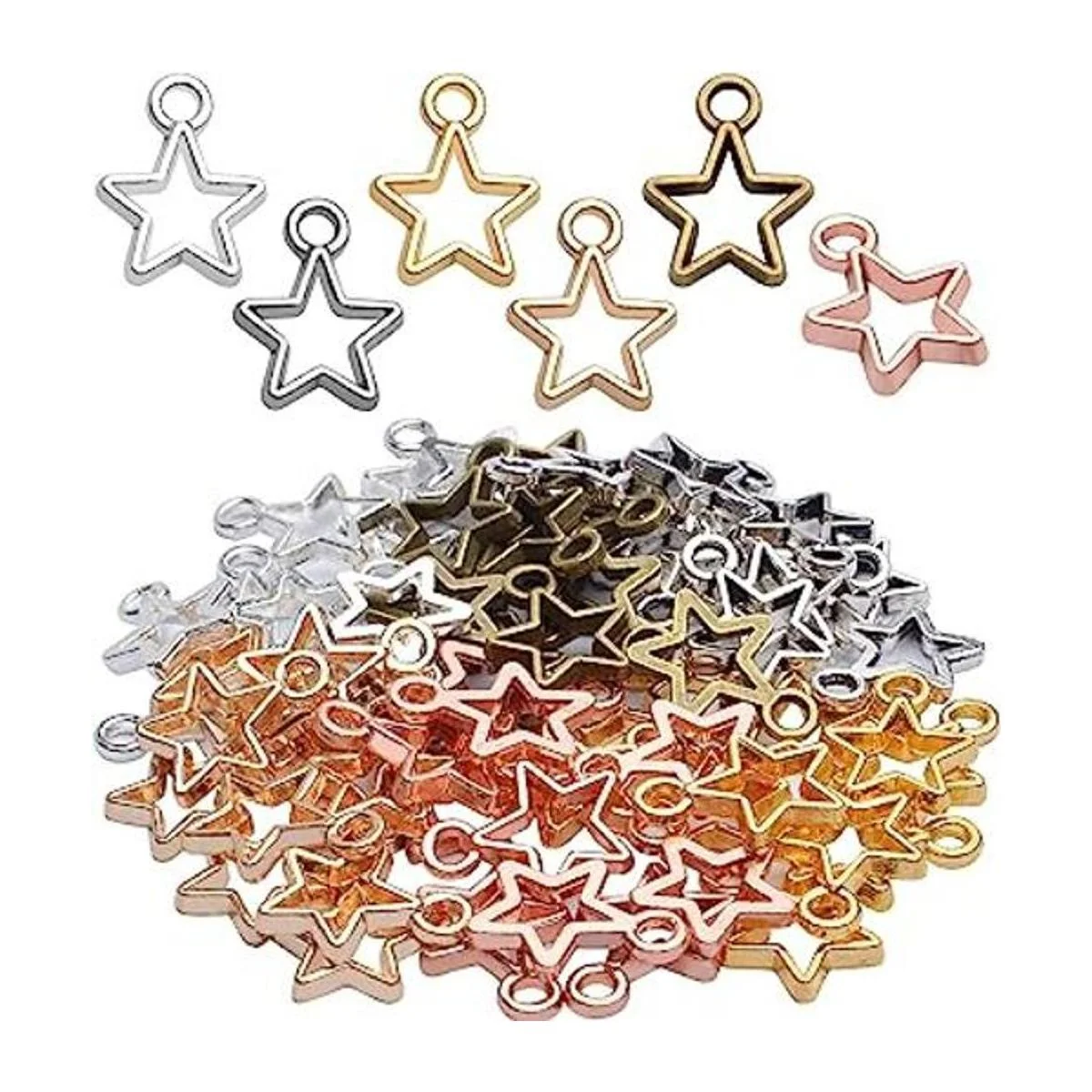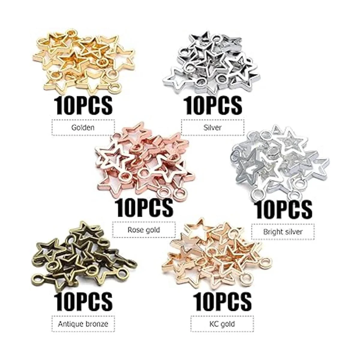 Los abalorios de estrella se mezclan en 6 colores diferentes, incluyendo oro, plata, plata brillante, bronce antiguo, oro brillante y oro rosa, simple y elegante, no es fácil de pasar de moda, haciendo que tus joyas sean más modernas y especiales.
