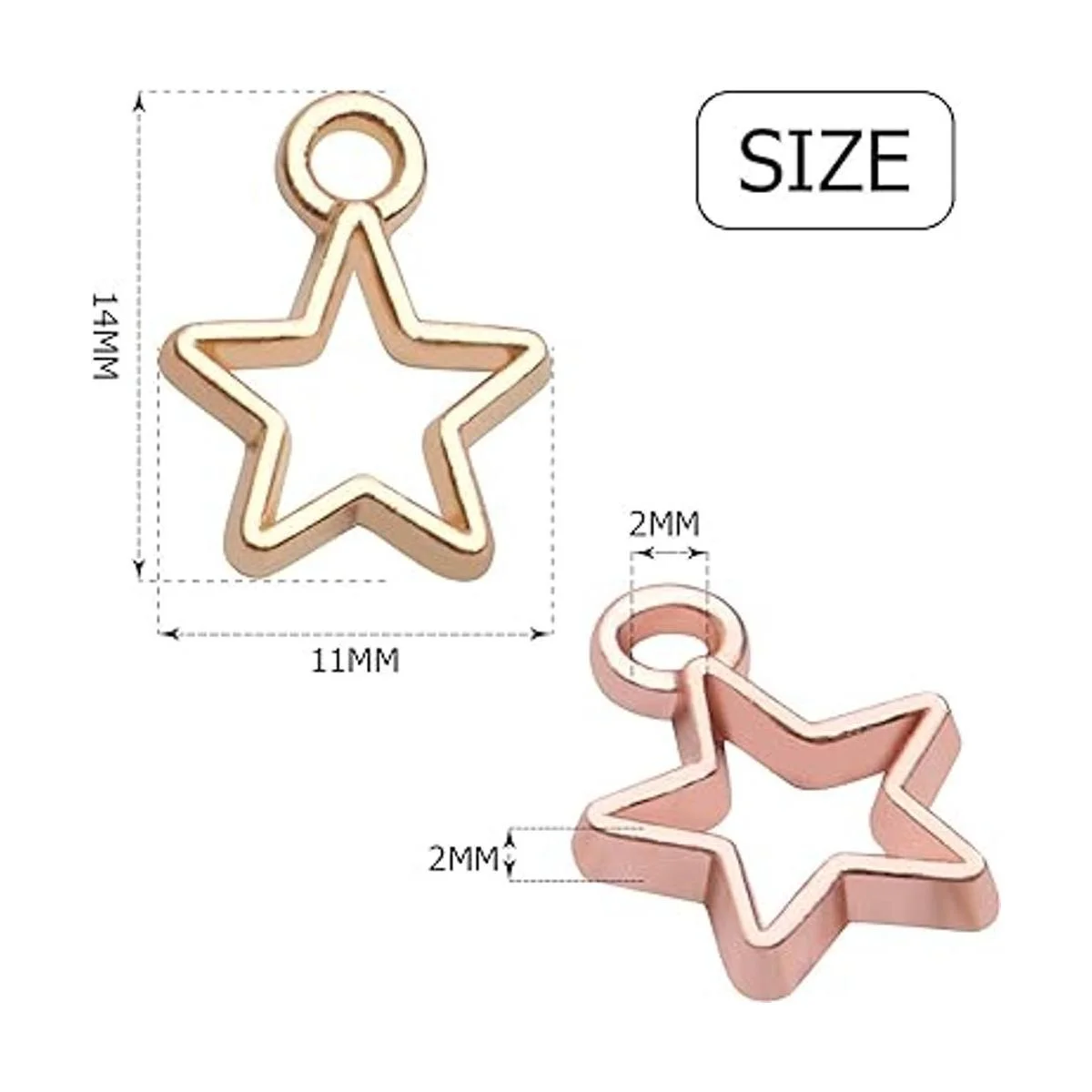 Tamaño adecuado: los colgantes de estrella son de 0.551 in de largo, 0.433 in de ancho, 0.079 in de grosor, el agujero es de 0.079 in. Ideal para decorar joyas delicadas, y se puede colgar fácilmente de diseños.