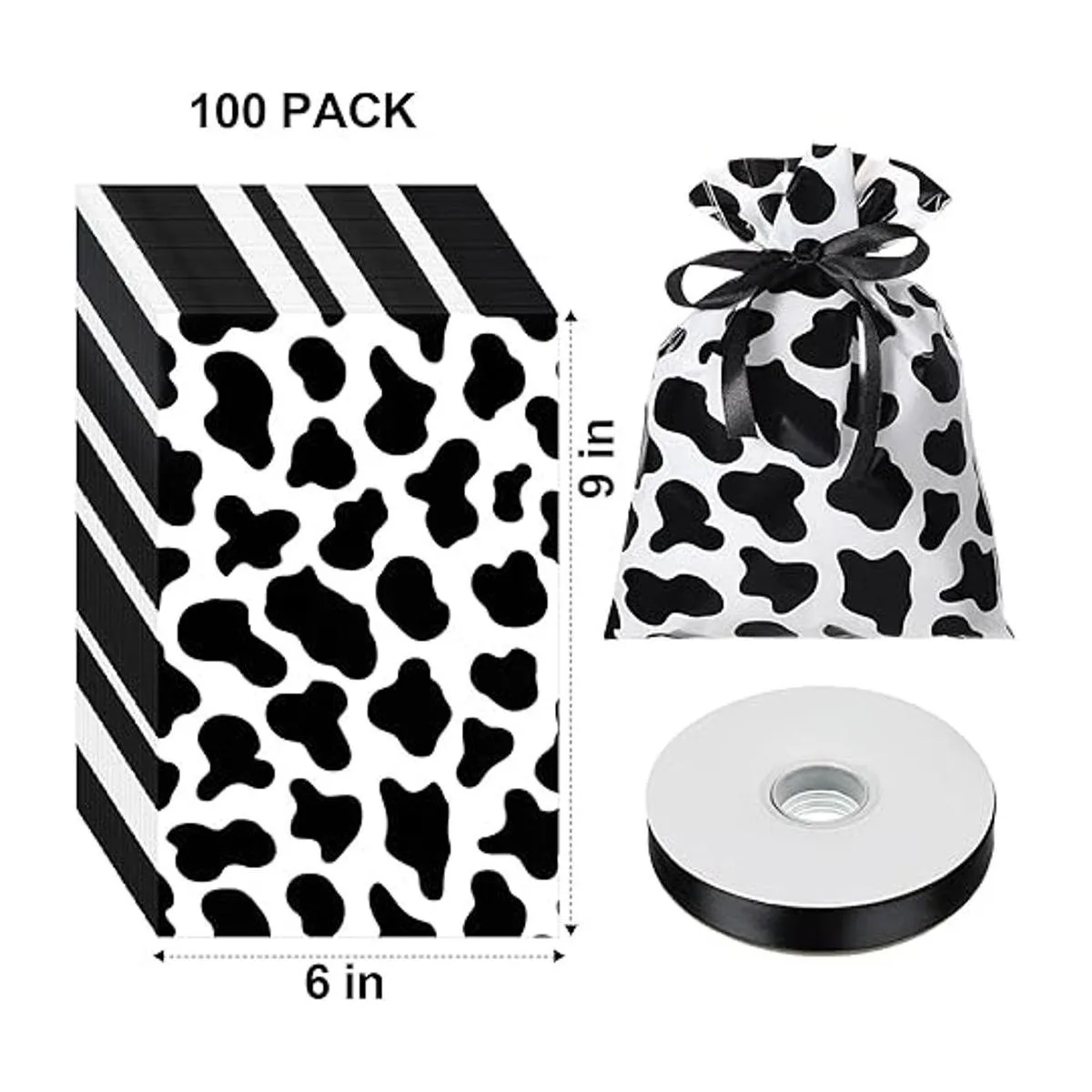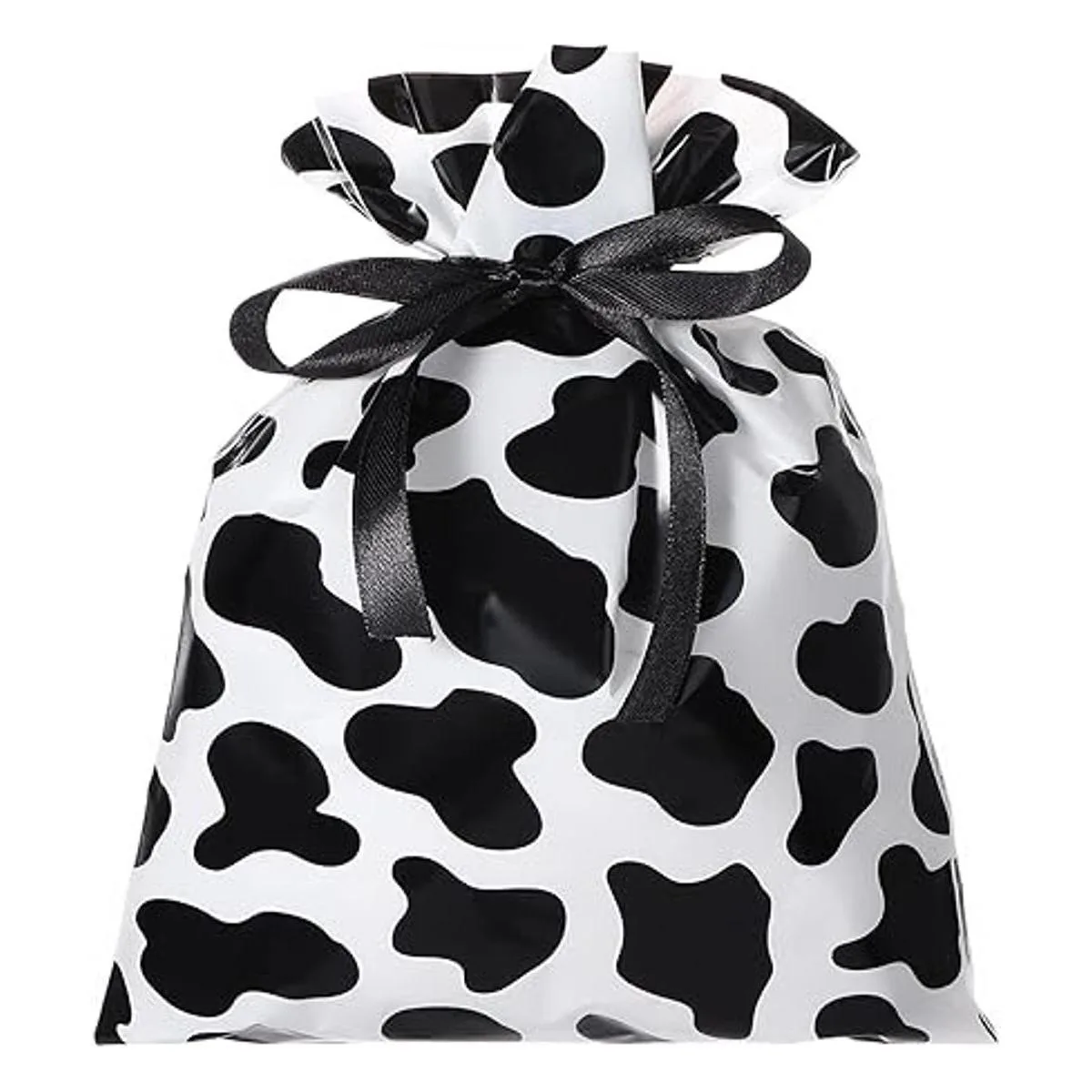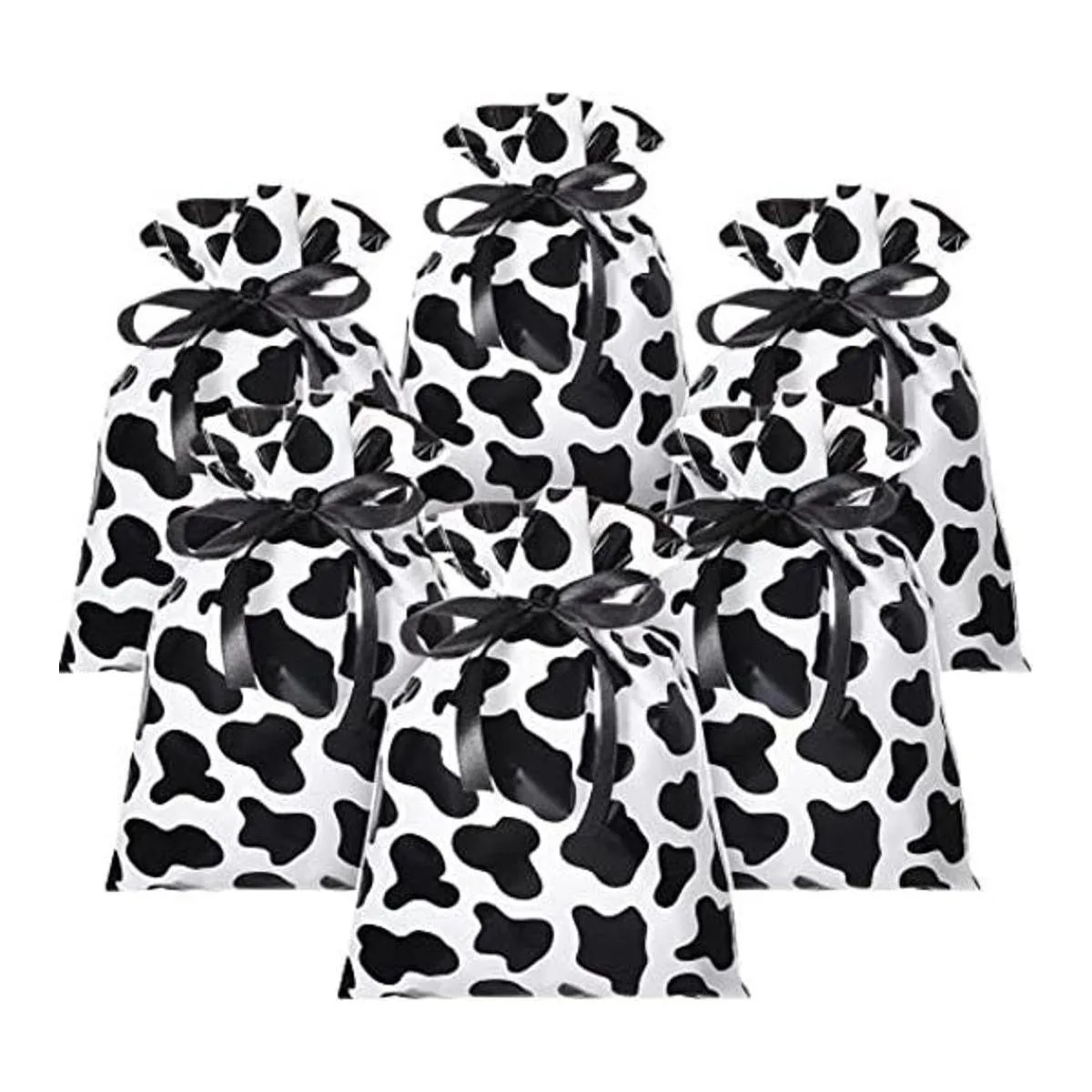 Información de tallas: cada bolsa de dulces de vacas negras mide aproximadamente aprox. 9 x 6 pulgadas, tamaño adecuado para poner algunos objetos pequeños, y cada corbata giratoria es de aprox. 0.39 pulgadas de ancho, puedes atar la boca de la bolsa con la corbata giratoria para hacer un nudo