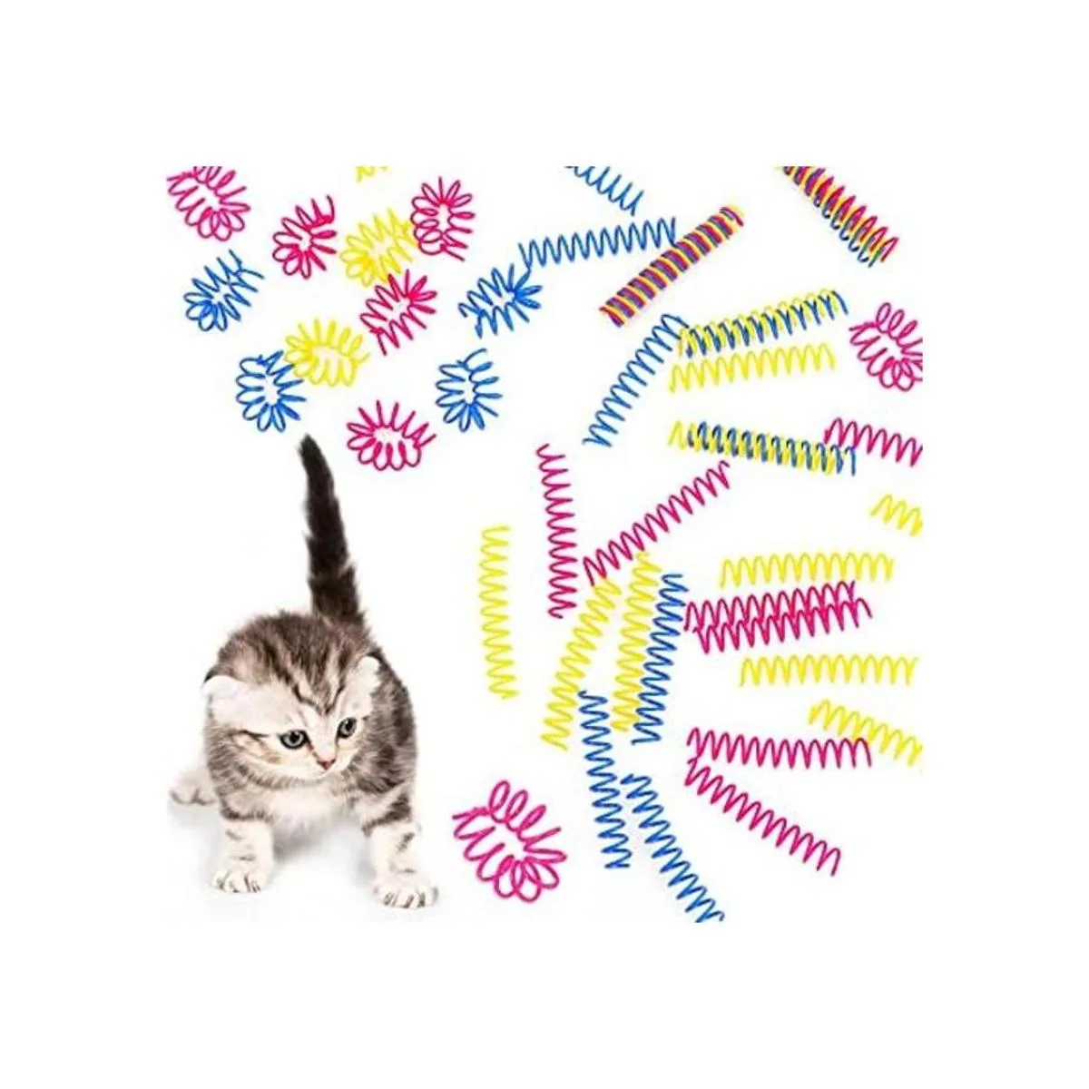 Cantidad del paquete: el paquete viene con 60 piezas de juguetes de primavera para gatos en 3 colores, incluyendo rosa, azul y amarillo, 20 piezas para cada color, cantidad suficiente para que tus gatos jueguen; también puedes compartirlos con tus amigos que crian gatos