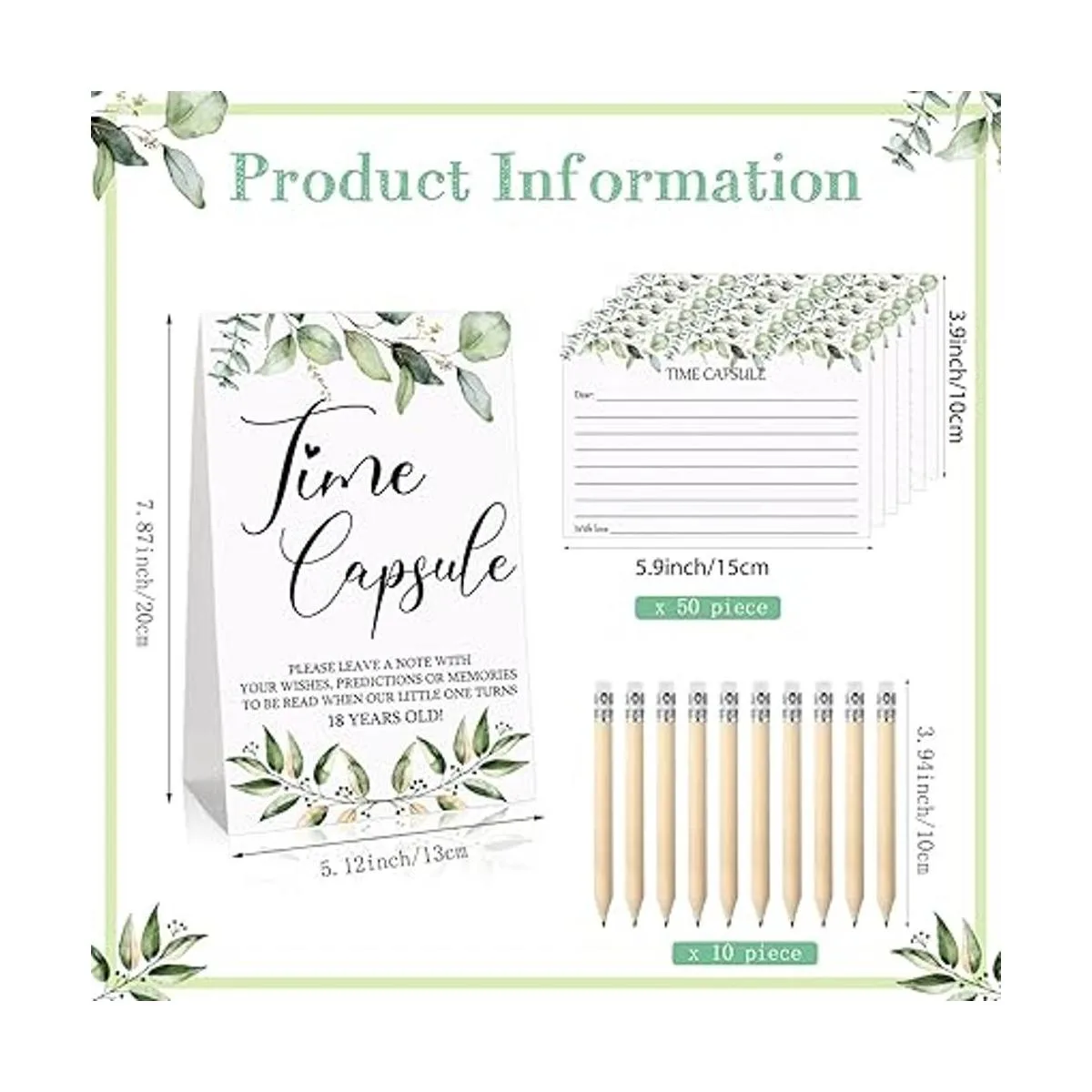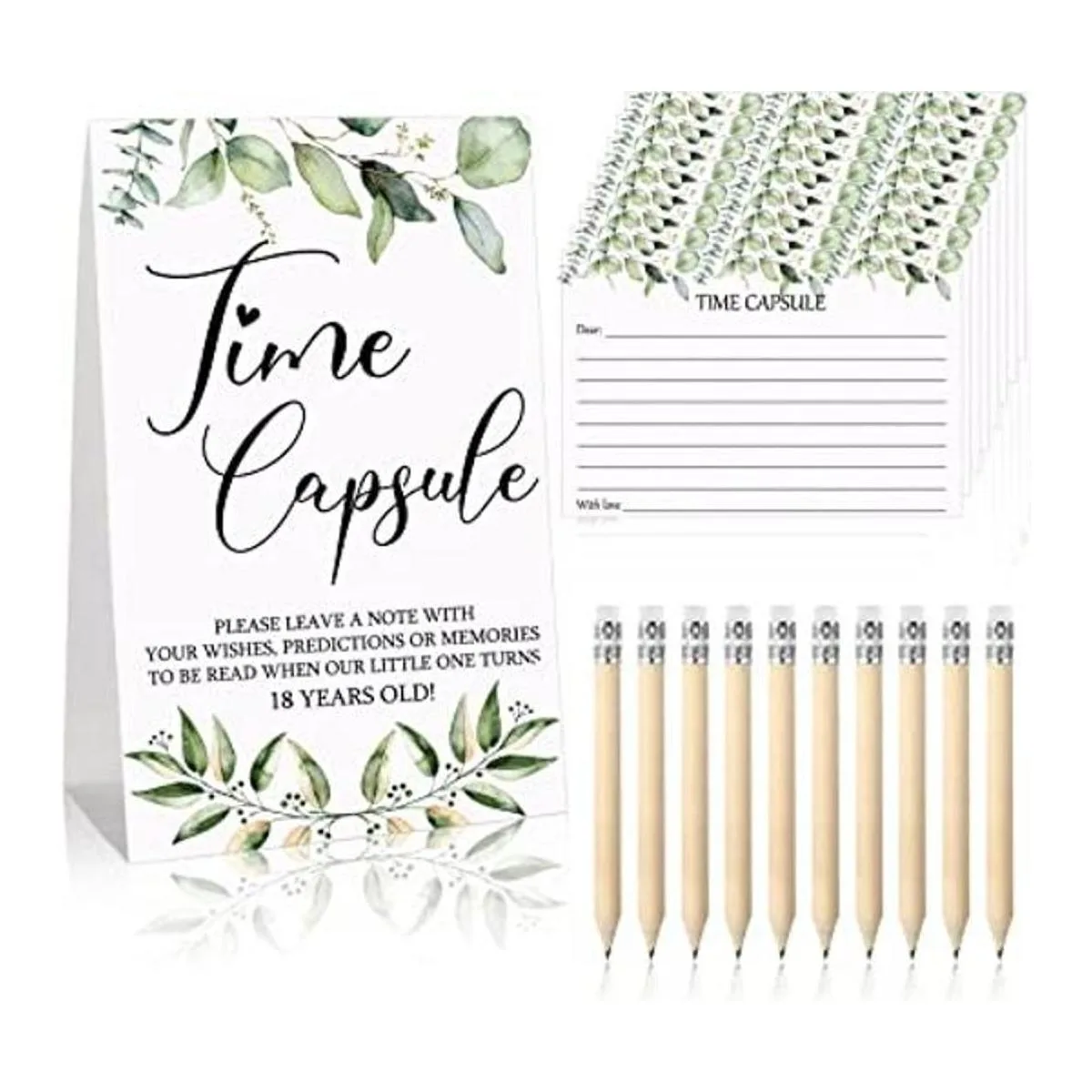 Lo que obtendrás: el paquete contiene 1 juego de regalos de juegos de baby shower, incluyendo 1 letrero de cápsula de tiempo, 50 tarjetas de cápsula de tiempo y 10 mini lápices; un juego completo y amplias cantidades para tus necesidades de fiesta