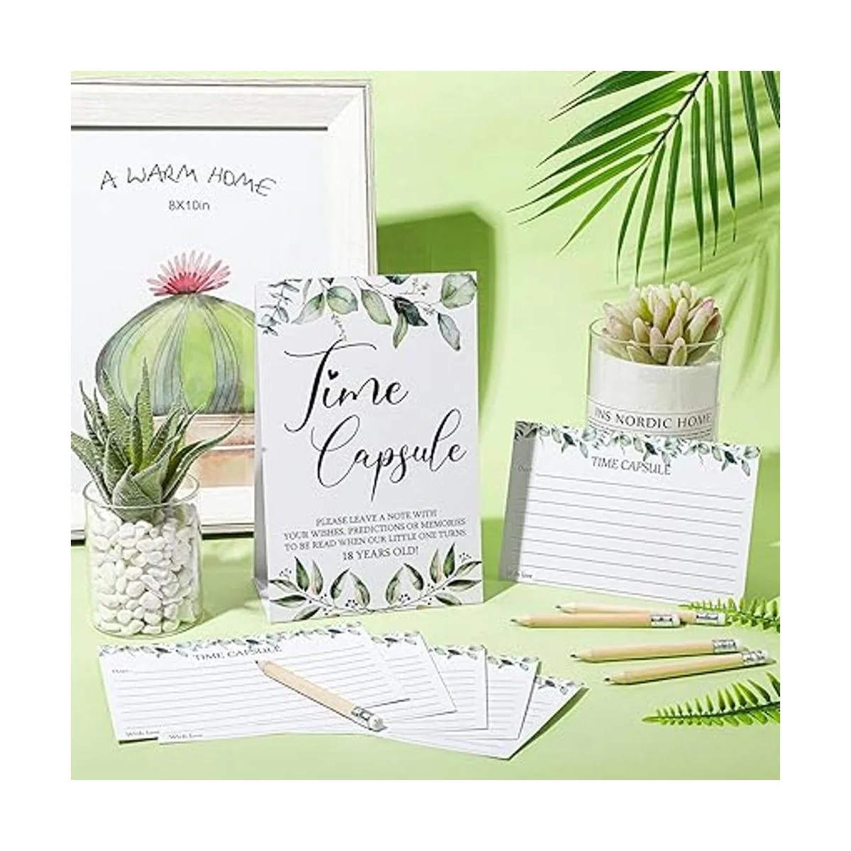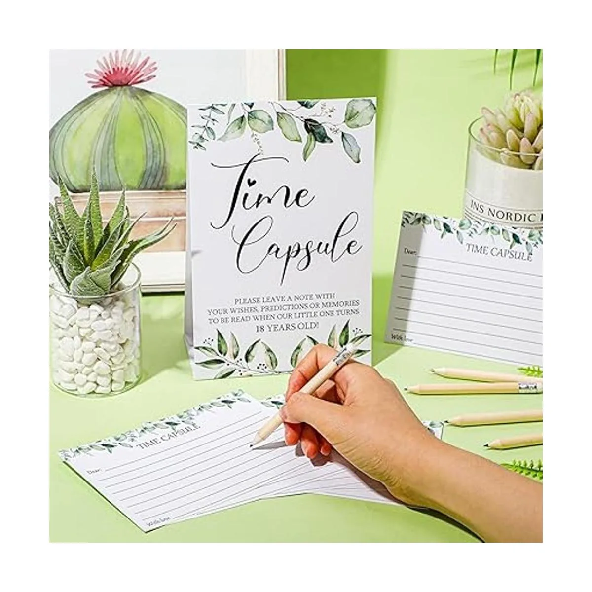 61 piezas de juegos de baby shower incluyen letrero de cápsula de tiempo y 50 tarjetas de mensaje de cápsula de tiempo, tarjetas de consejos y deseos de verdes, tarjeta de aniversario con 10 lápices para suministros de fiesta de baby shower