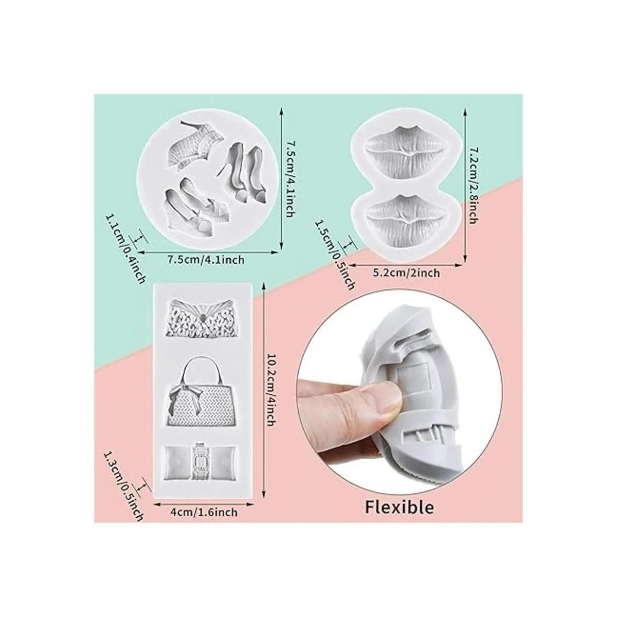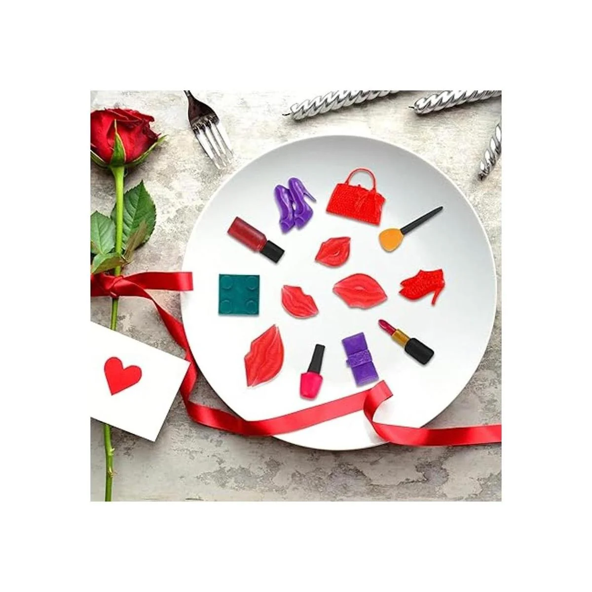 Diseños emocionantes: como se puede ver en las imágenes, estos moldes de silicona para dulces de fondant están diseñados con varios elementos chic y dulces, como labios, bolso, esmalte de uñas, zapatos de tacón, pintalabios, perfume y así sucesivamente, fácil de crear formas detalladas en emocionantes diseños para sorprender a tus amigos, invitados o amantes, te da diferentes experiencias de horneado