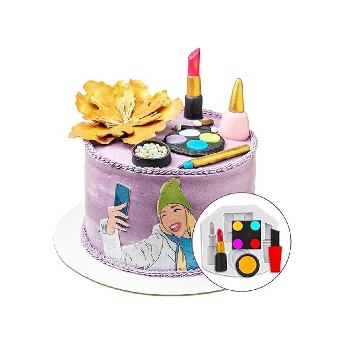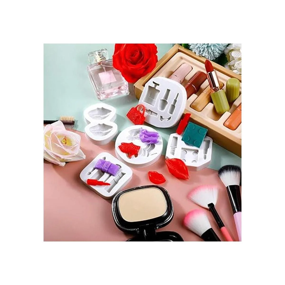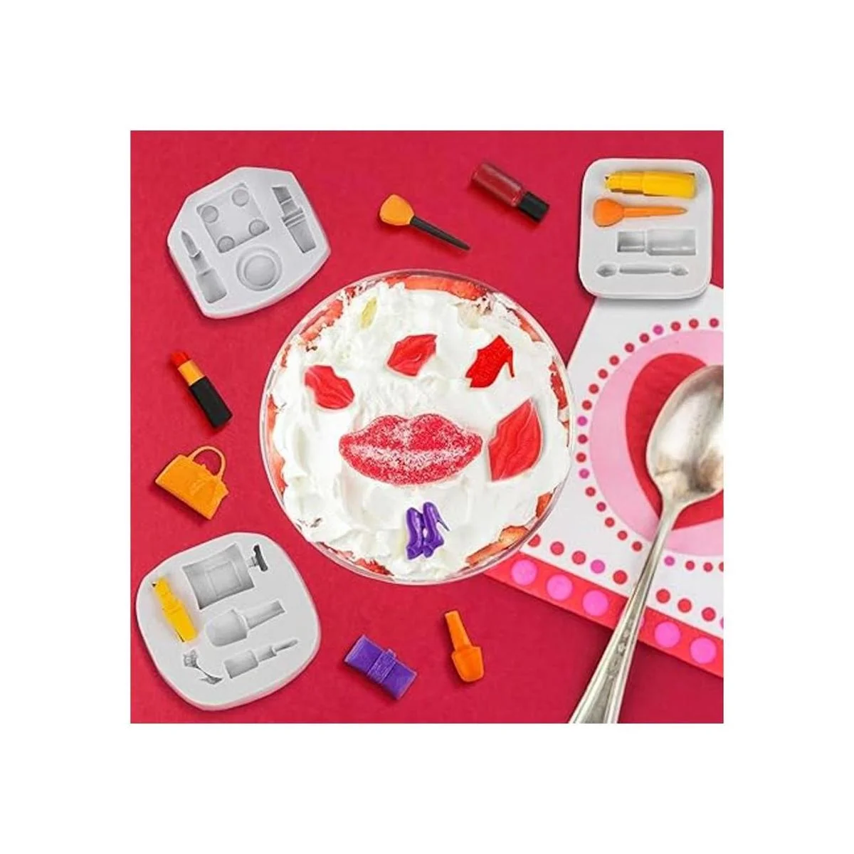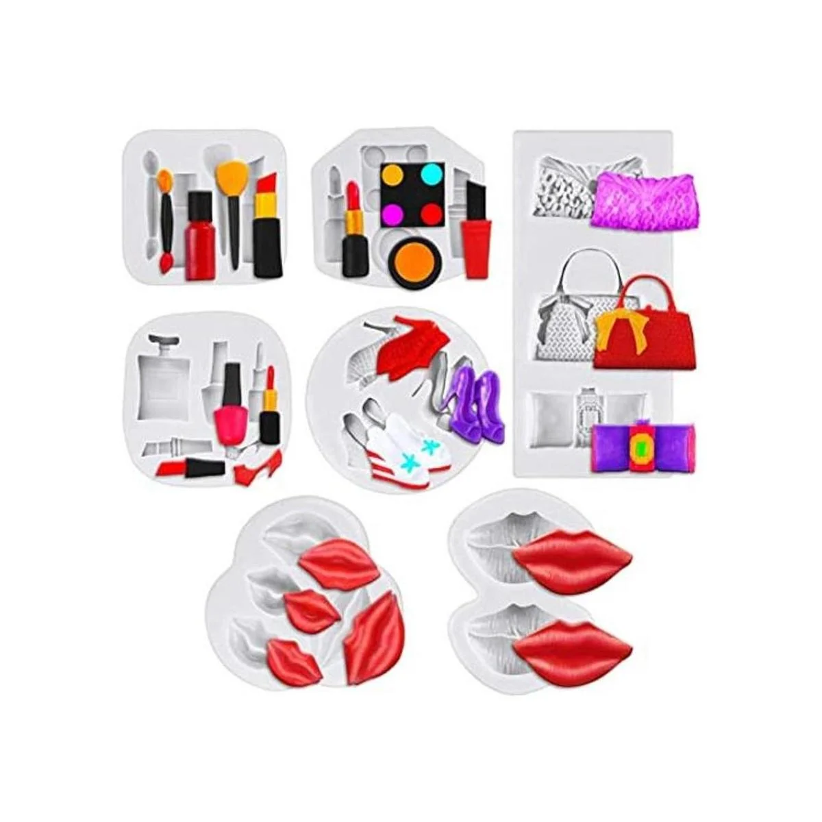 7 piezas de maquillaje temático silicona moldes beso labio fondant caramelo molde lápiz labial perfume tacones altos molde bolso esmalte de uñas 3D fondant pastel moldes para el día de San Valentín chocolate magdalena resina artesanía DIY