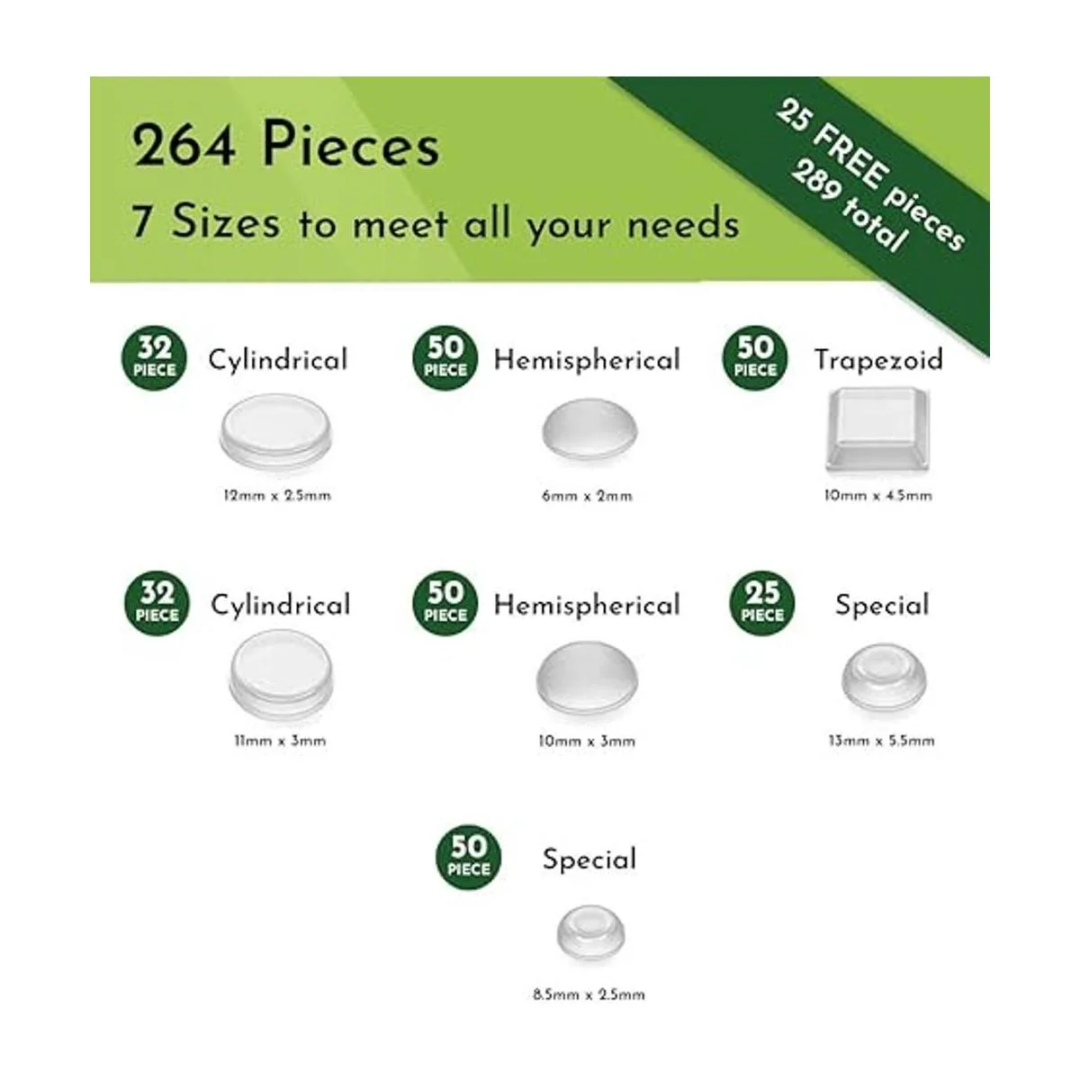 Fácil de aplicar, no requiere herramientas. Almohadillas de silicona autoadhesivas muy fáciles de aplicar. Simplemente retira la lámina adhesiva y presiona firmemente sobre una superficie limpia y seca. Hay 289 almohadillas, en 7 tamaños diferentes en cada paquete. abajo para información de tallas