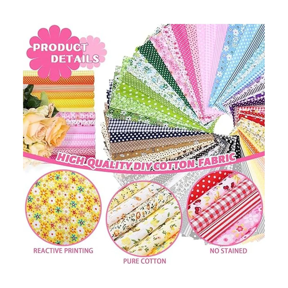 Lo que obtendrás: hay 70 piezas de telas de algodón impresas en el paquete, que están diseñadas con diferentes patrones, y el tamaño de cada tela es de aproximadamente 9.8 x 9.8 in, suficiente y adecuado para satisfacer tus diferentes preferencias y necesidades en la vida diaria