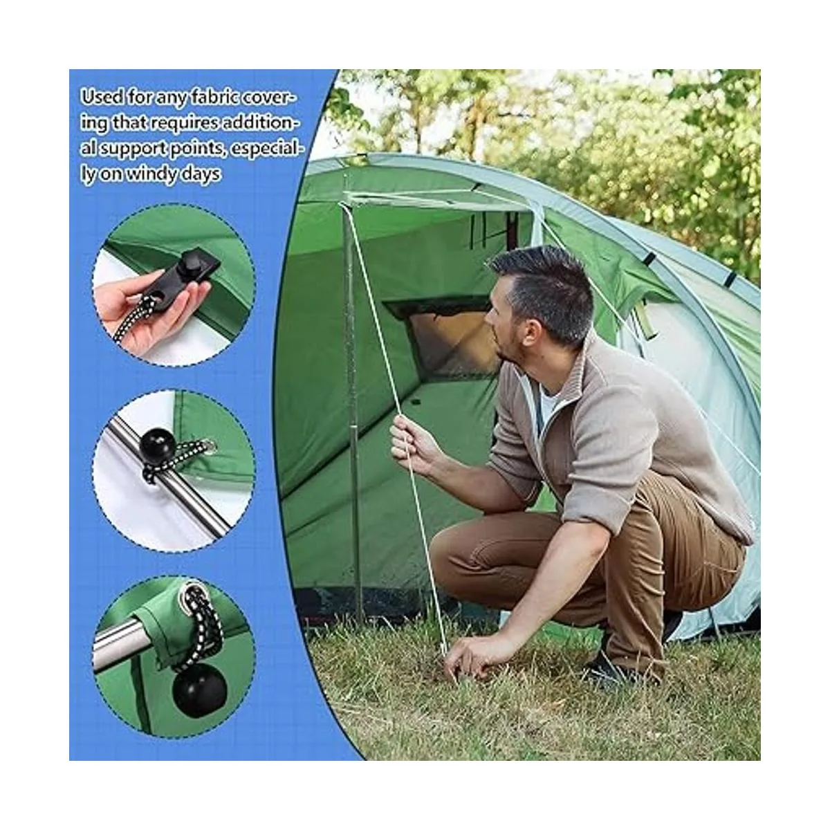 Amplia aplicación: este juego de cordón elástico multiusos y clips de lona es ideal para tiendas de campaña al aire libre, toldos, caravanas, lonas, refugios temporales, viseras solares, pantallas de proyector temporal, fundas de sofá y fundas de barbacoa