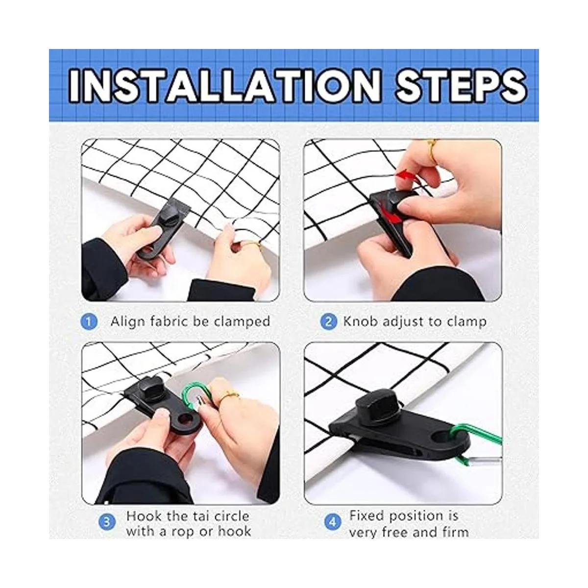 Fácil de usar: los clips de lona son fáciles de instalar o quitar, simplemente ajusta el grado de holgura o tensión; el agujero del clip de tienda de campaña es de 0.5 pulgadas de diámetro para fijar cualquier cordón elástico estándar, amarre o cordón