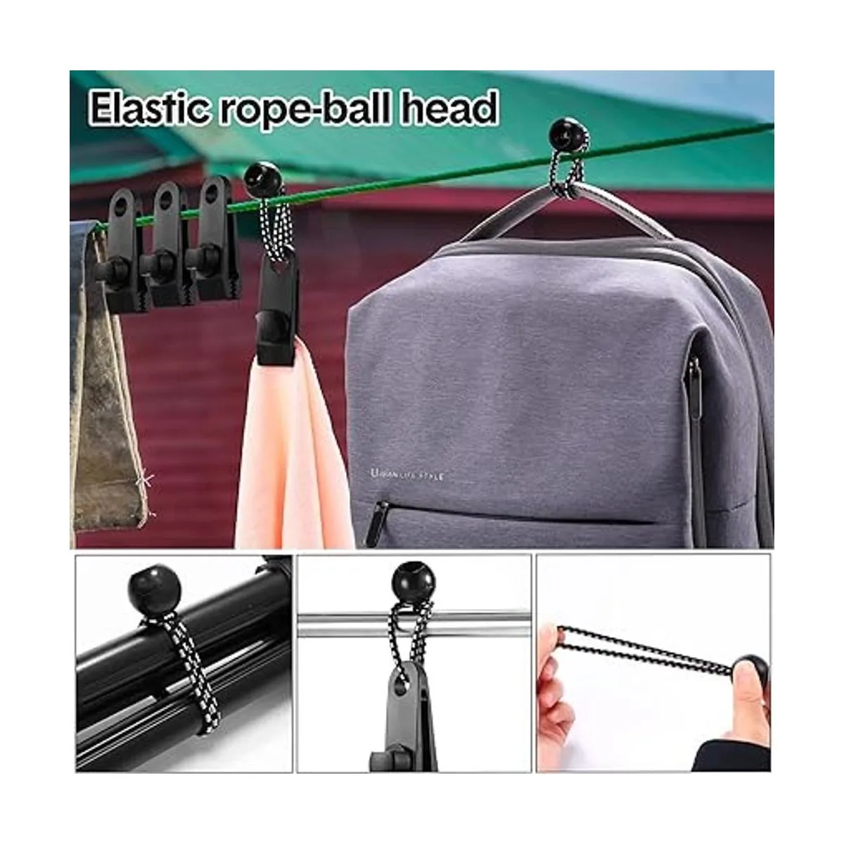 Cordones elásticos de bola: hechos de goma real, resistente, resistente a la intemperie, y se pueden aplicar ampliamente en varias ocasiones en interiores y exteriores para fijar objetos pequeños como toldos, lonas, correas, tiendas de campaña, paños de sombra, postes de utilidad y cables, etc